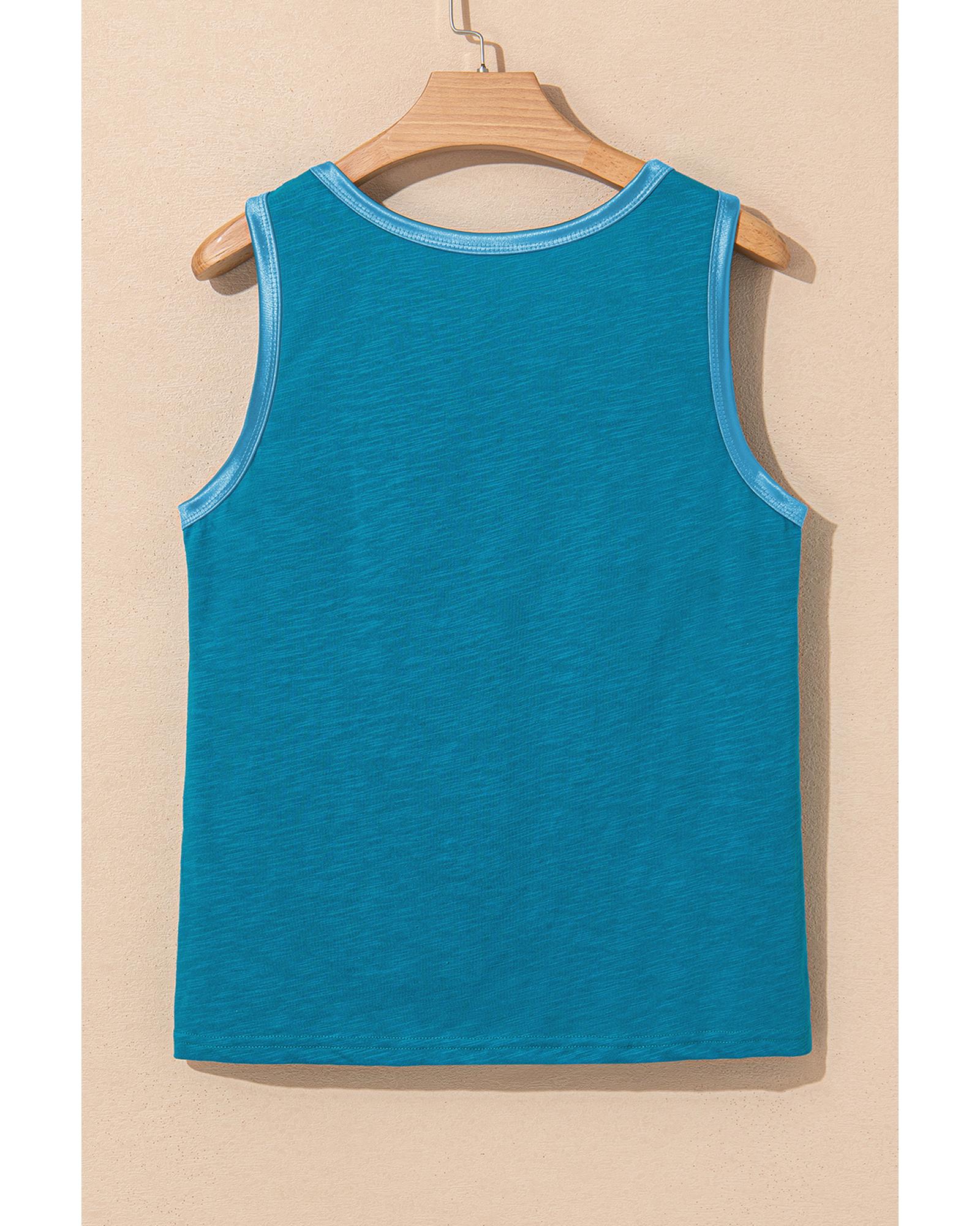 This tank top features a striking metallic sheen edge that adds a touch of glamour to your outfit. Its flattering scoop neckline enhances the overall look, making it suitable for various occasions. Crafted from a soft and breathable cotton blend fabric, it offers all-day comfort and versatility, whether layered or worn alone.