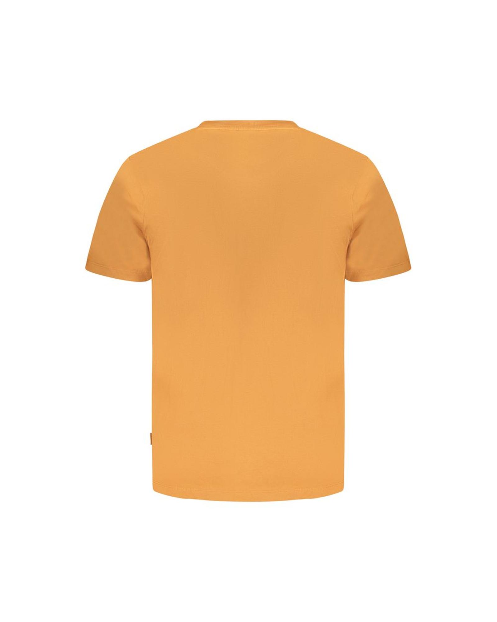 This men’s orange cotton T-shirt features a classic short sleeve design with a crew neck. It is made from 100% sustainable cotton, offering comfort and eco-friendliness. The shirt includes printed graphics and logos, making it a stylish addition to casual wear.