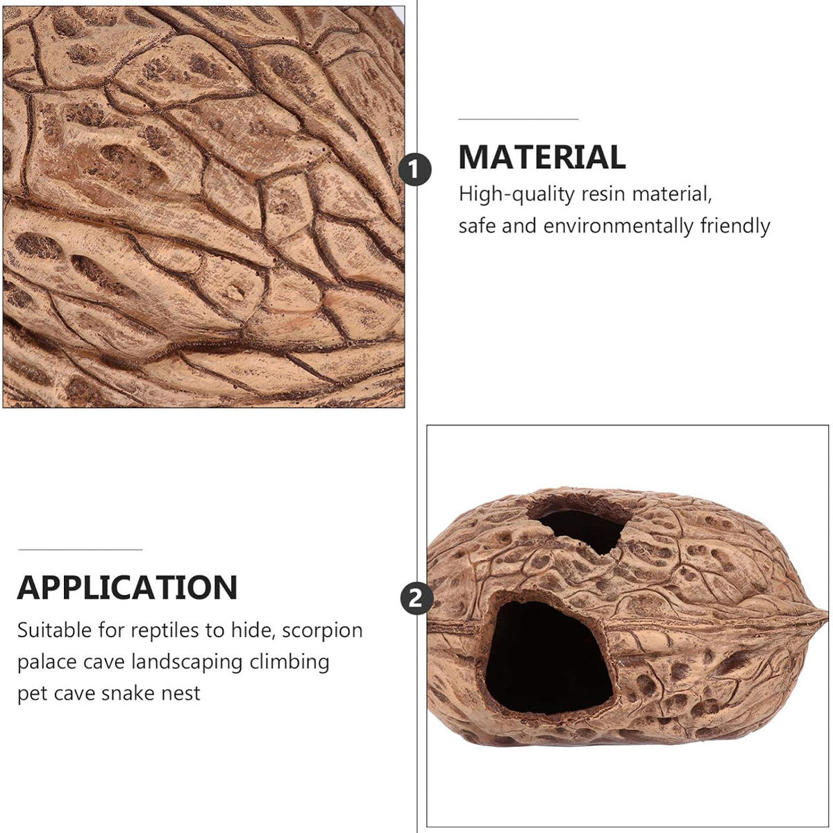 This pet climbing shelter is designed to create a natural and enriching environment for small animals or reptiles. It features a realistic walnut shape that adds a decorative touch to any habitat, providing a secure and cozy hiding spot to help reduce stress. Made from durable resin, it supports climbing and burrowing behaviors, making it suitable for various terrariums and aquariums.
