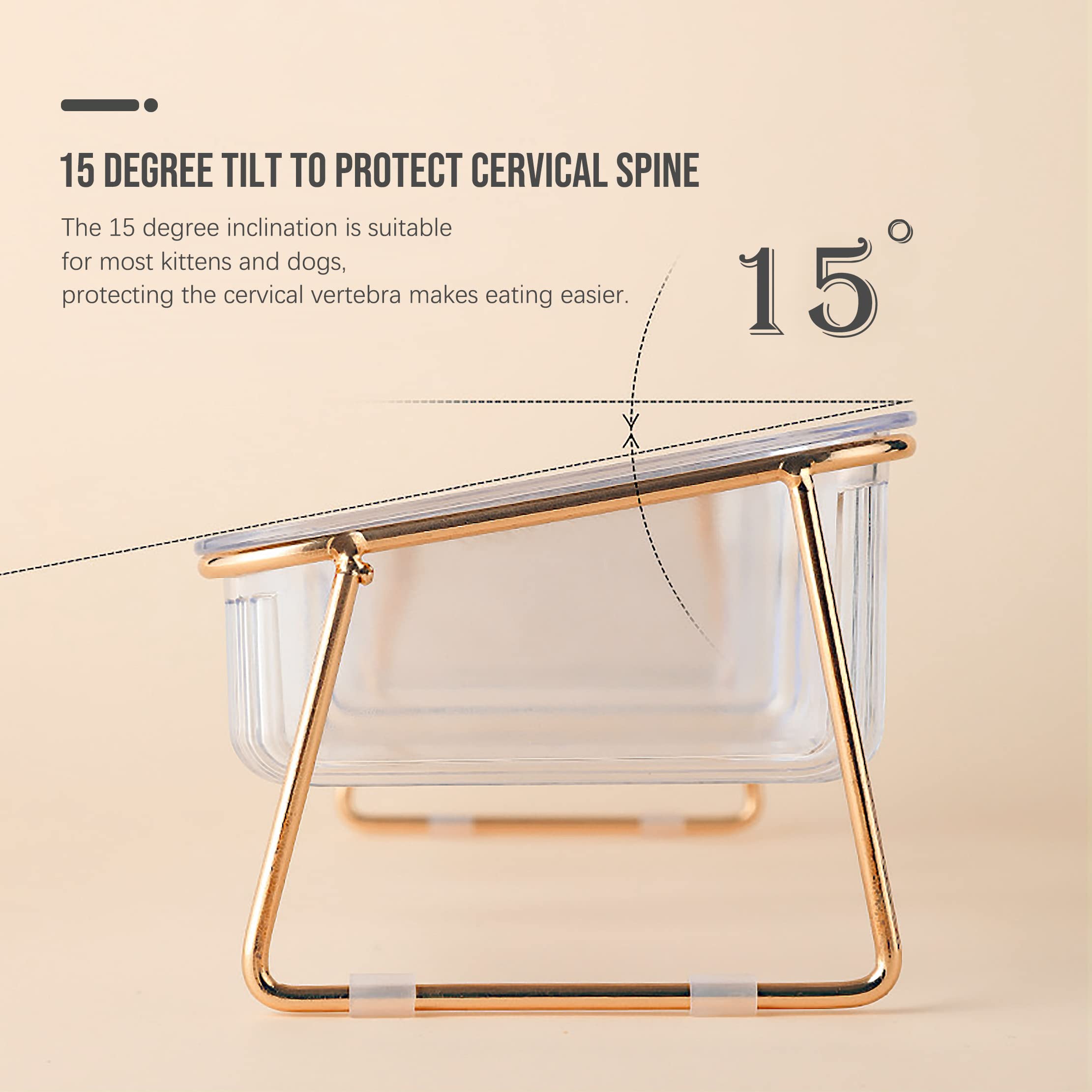The bowls feature a 15-degree tilt to reduce neck strain and help protect the pet’s cervical spine. They are transparent, removable for easy cleaning, and come with anti-slip mats on the bottom of the stand to prevent sliding and tipping during use.