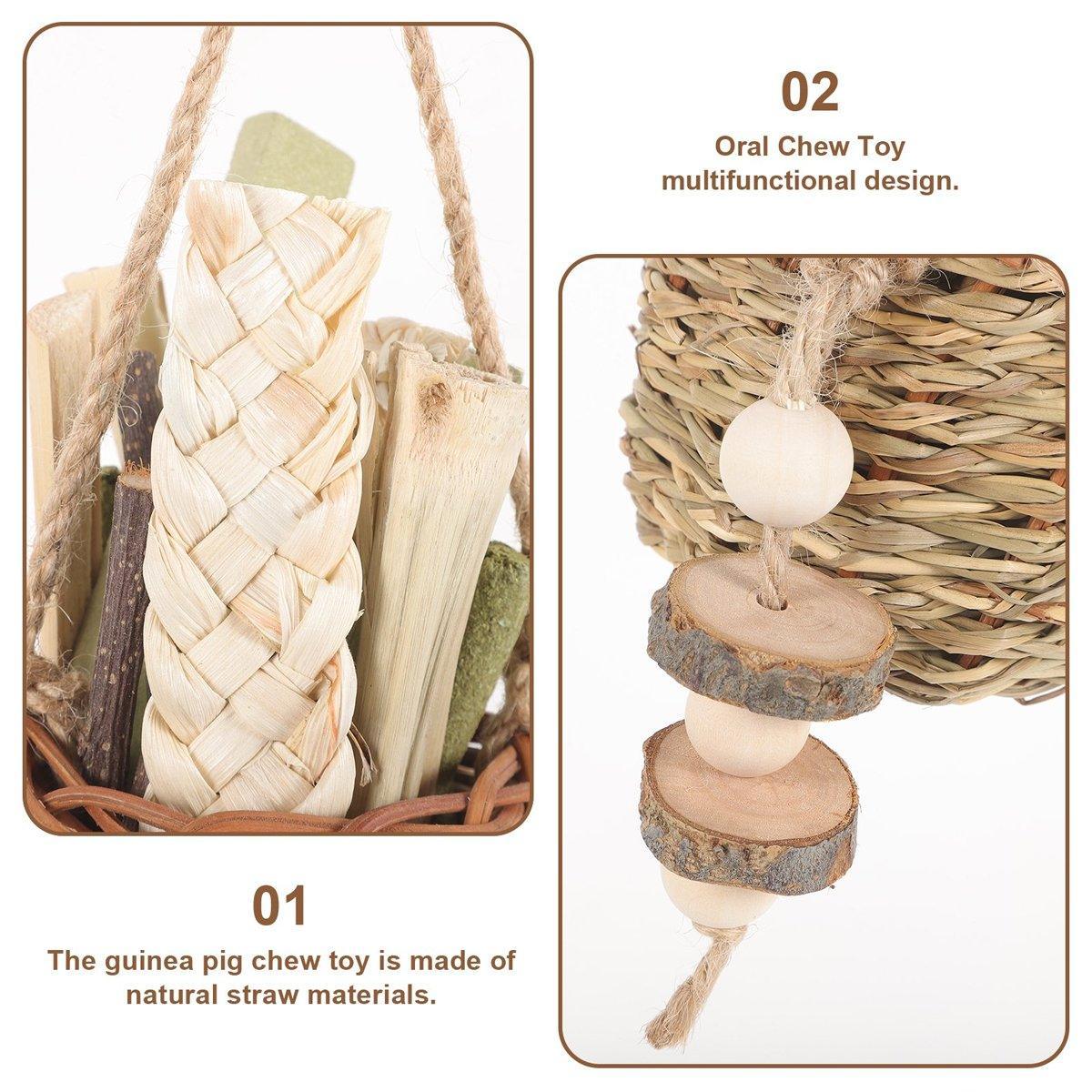 This pet teething stick set provides small animals with a fun and healthy chewing experience. Made from natural materials, it promotes dental health, reduces stress, and encourages natural foraging behavior. Suitable for various small pets, the set includes different chewable sticks, braided toys, and an interactive hanging woven basket.