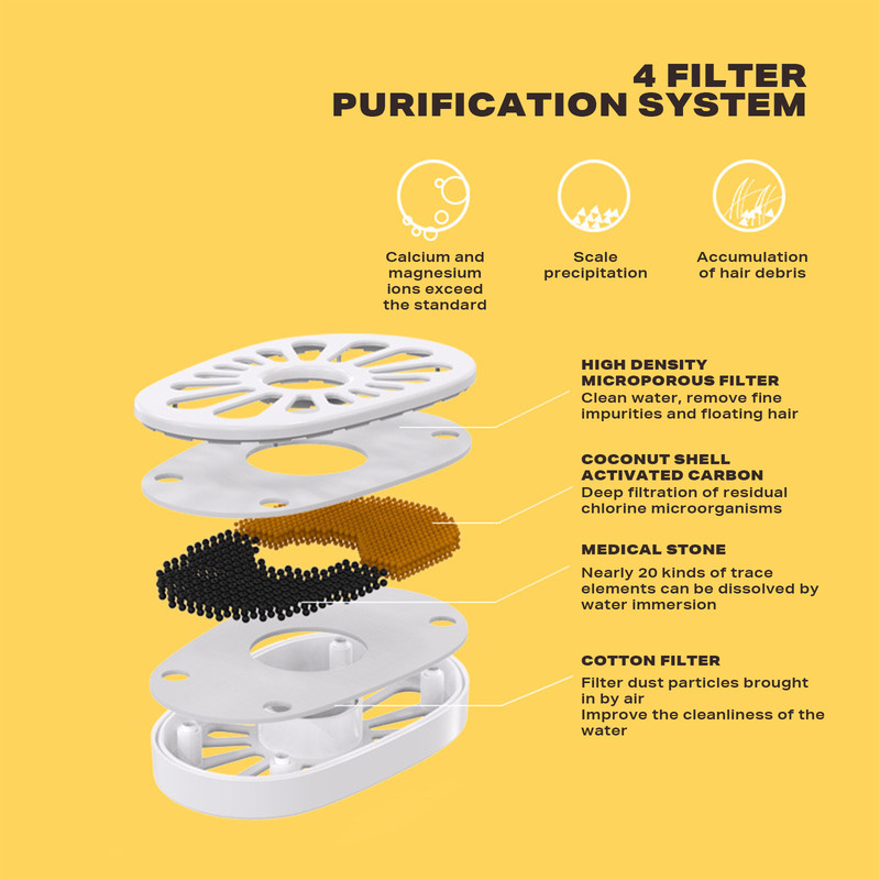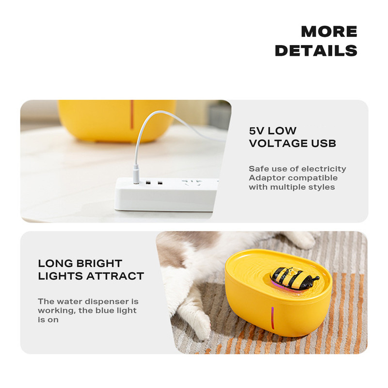 This automatic water fountain is designed for small to medium-sized pets, providing a continuous supply of fresh and hygienic water. It features a large 2-liter capacity and a circulation system that helps maintain water quality throughout the day. The fountain includes a replaceable filter to effectively remove hair, odors, and chlorine, ensuring cleaner water for your pets. Equipped with an LED indicator, it shows the water level and operational status, with a blue light indicating it is working and a red light indicating it is not. Powered by a USB cable, it is safe, hygienic, and easy to clean with dishwasher-safe components.