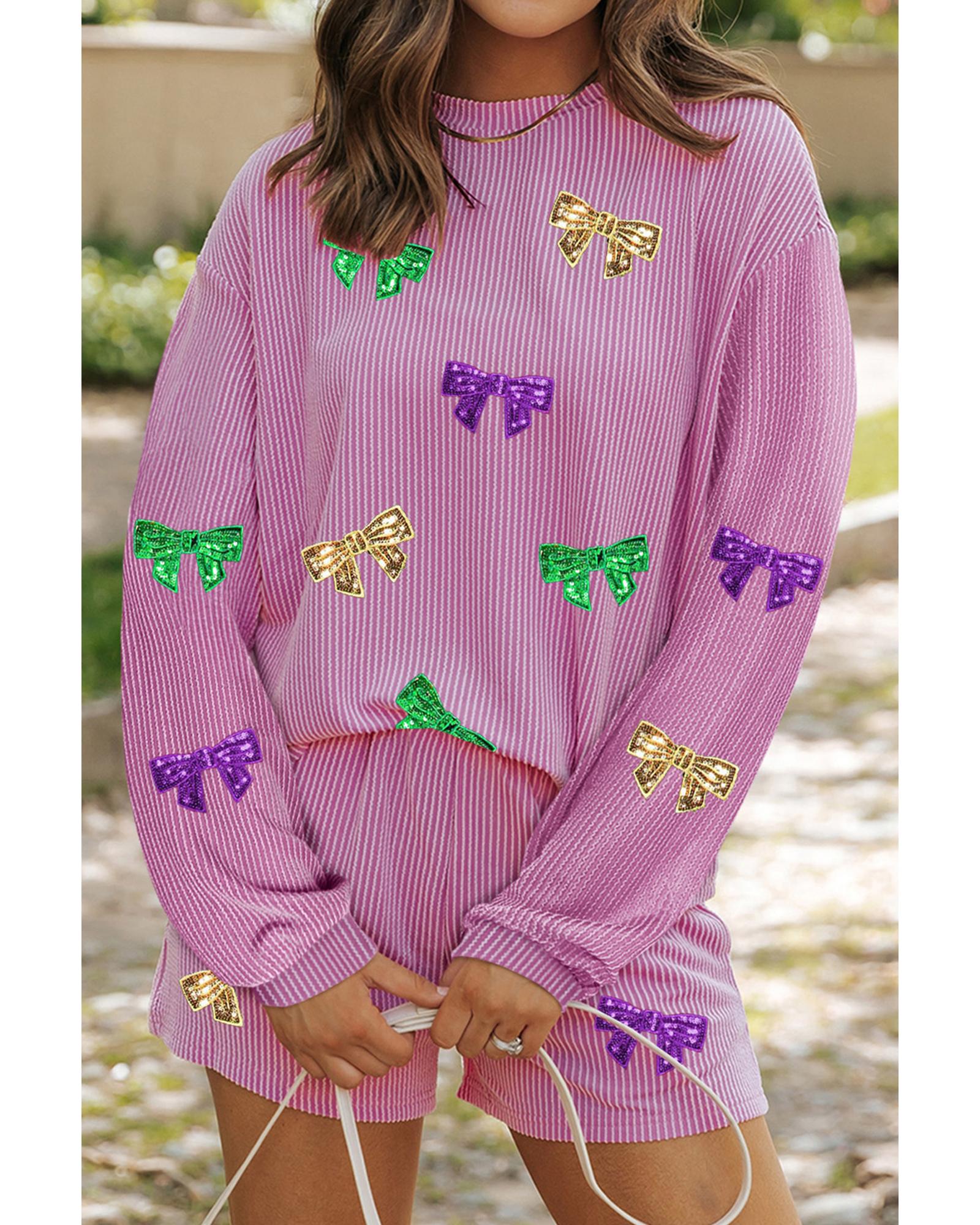 Phalaenopsis Bowknot Patched Pattern Corded Long Sleeve Top and Shorts Outfit – M