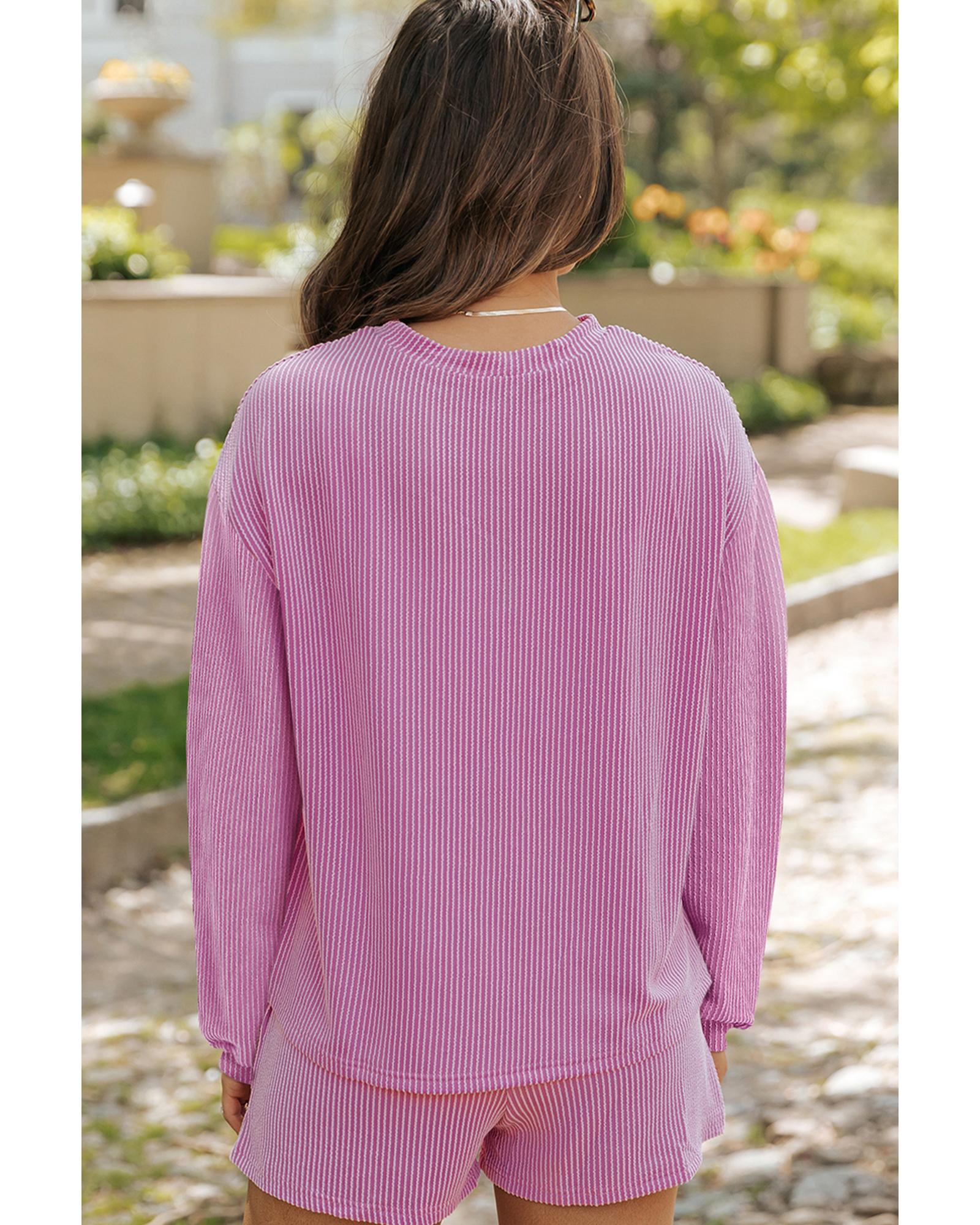 This long sleeve top and shorts outfit features a stylish design with a bowknot detail and patched patterns, creating a charming and unique look. Made from a corded fabric, it offers a cozy and textured feel, making it suitable for casual wear at home or outings.
