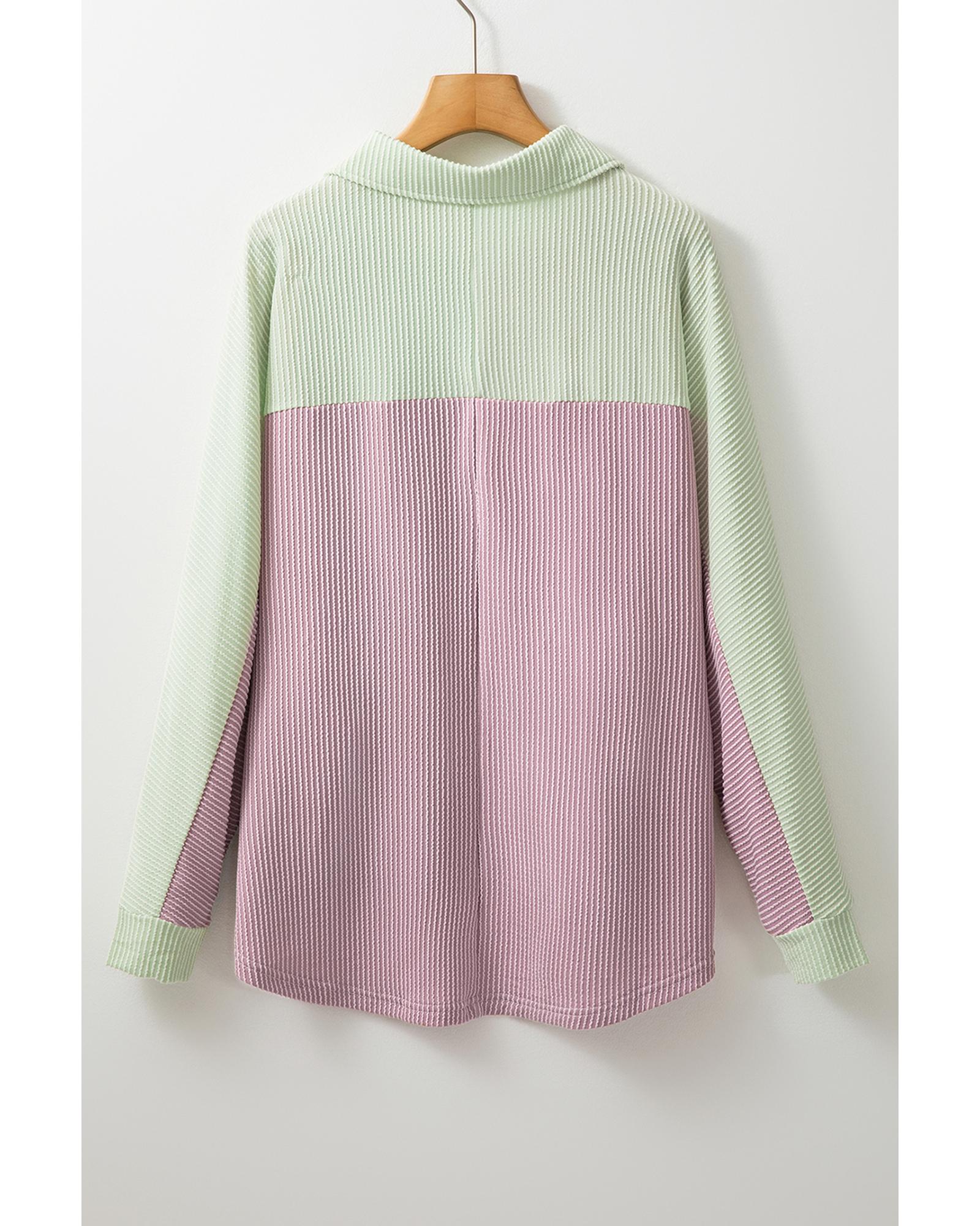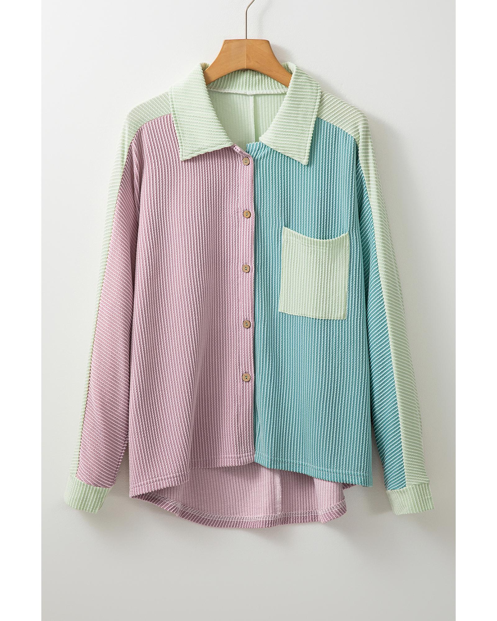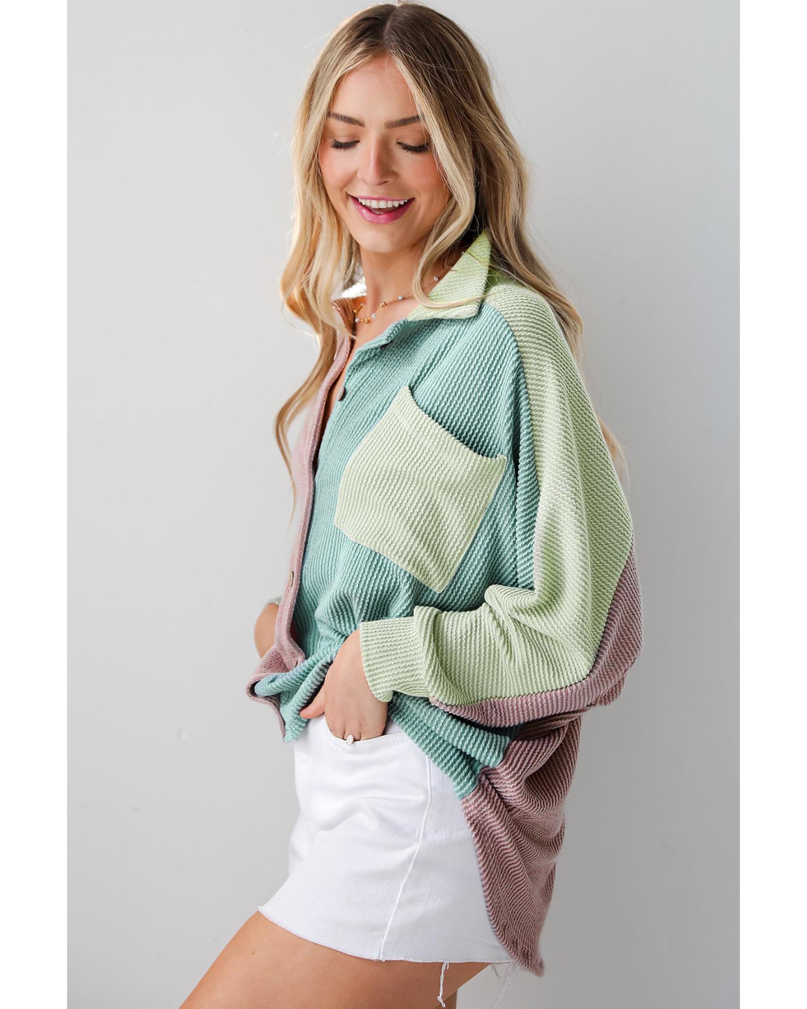 This oversized shacket features a stylish color block design with corded fabric, offering a unique texture and feel. Its relaxed fit provides comfort and versatility, making it suitable for various casual occasions. The classic shirt collar adds a polished touch to the overall look.
