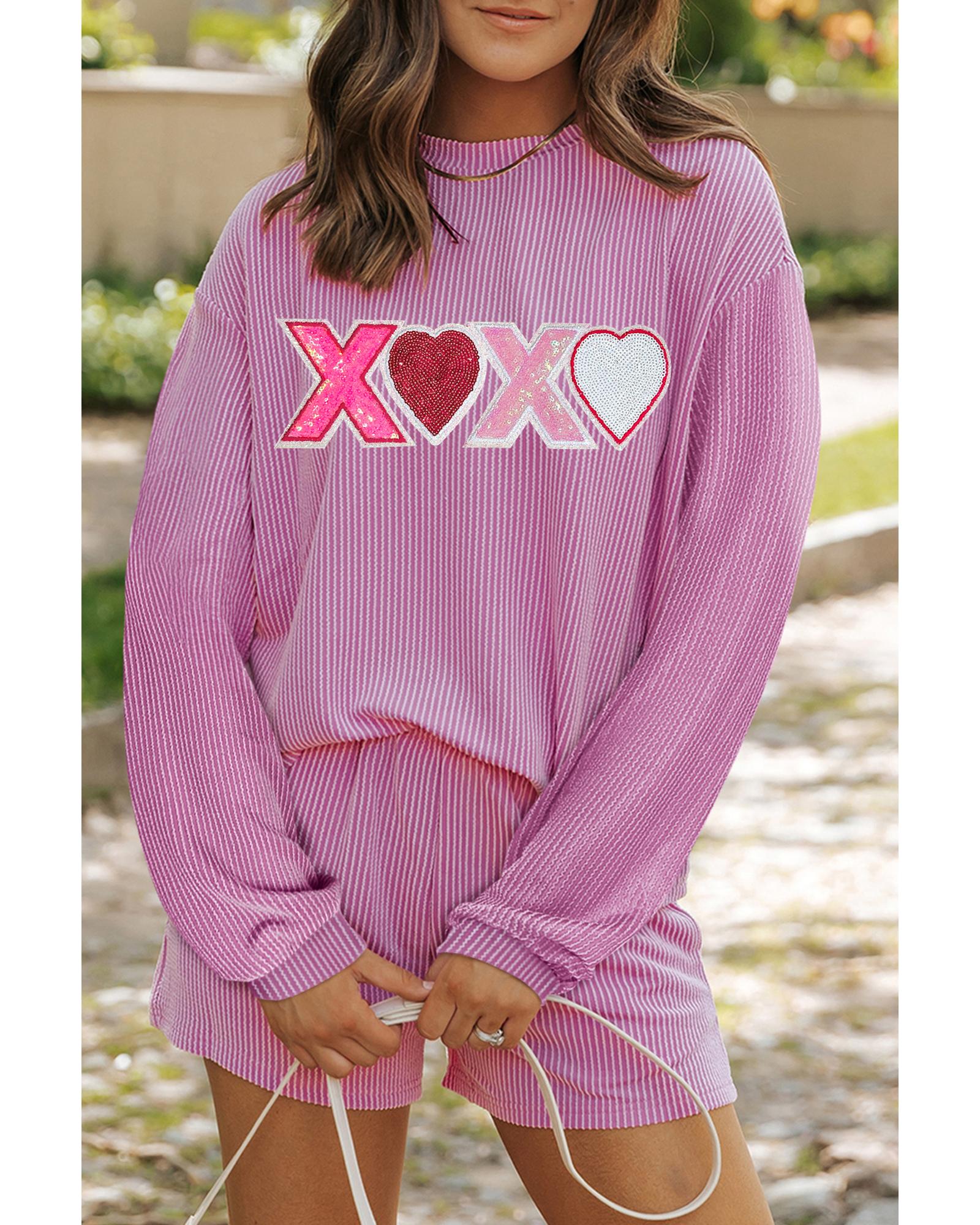 This long sleeve shorts set features a trendy fitted design with eye-catching corded detailing and a playful XOXO heart pattern. It offers versatile style suitable for various occasions, combining comfort and fashion in one ensemble.