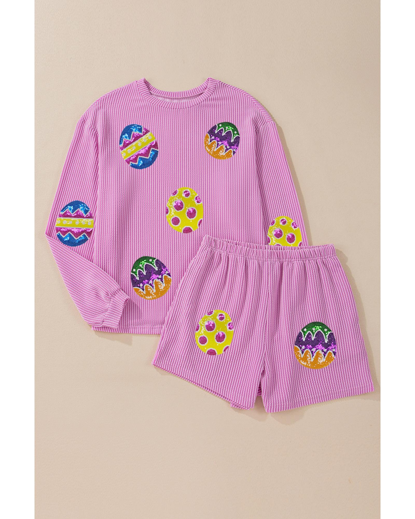 Phalaenopsis Easter Egg Patched Graphic Corded Long Sleeve Top Shorts Set – XL