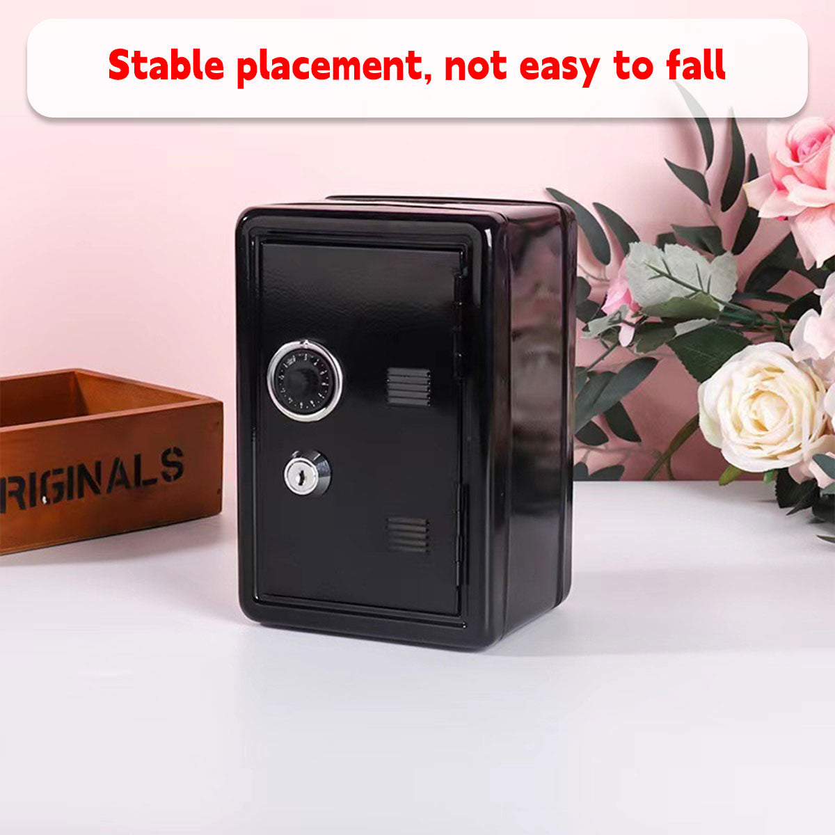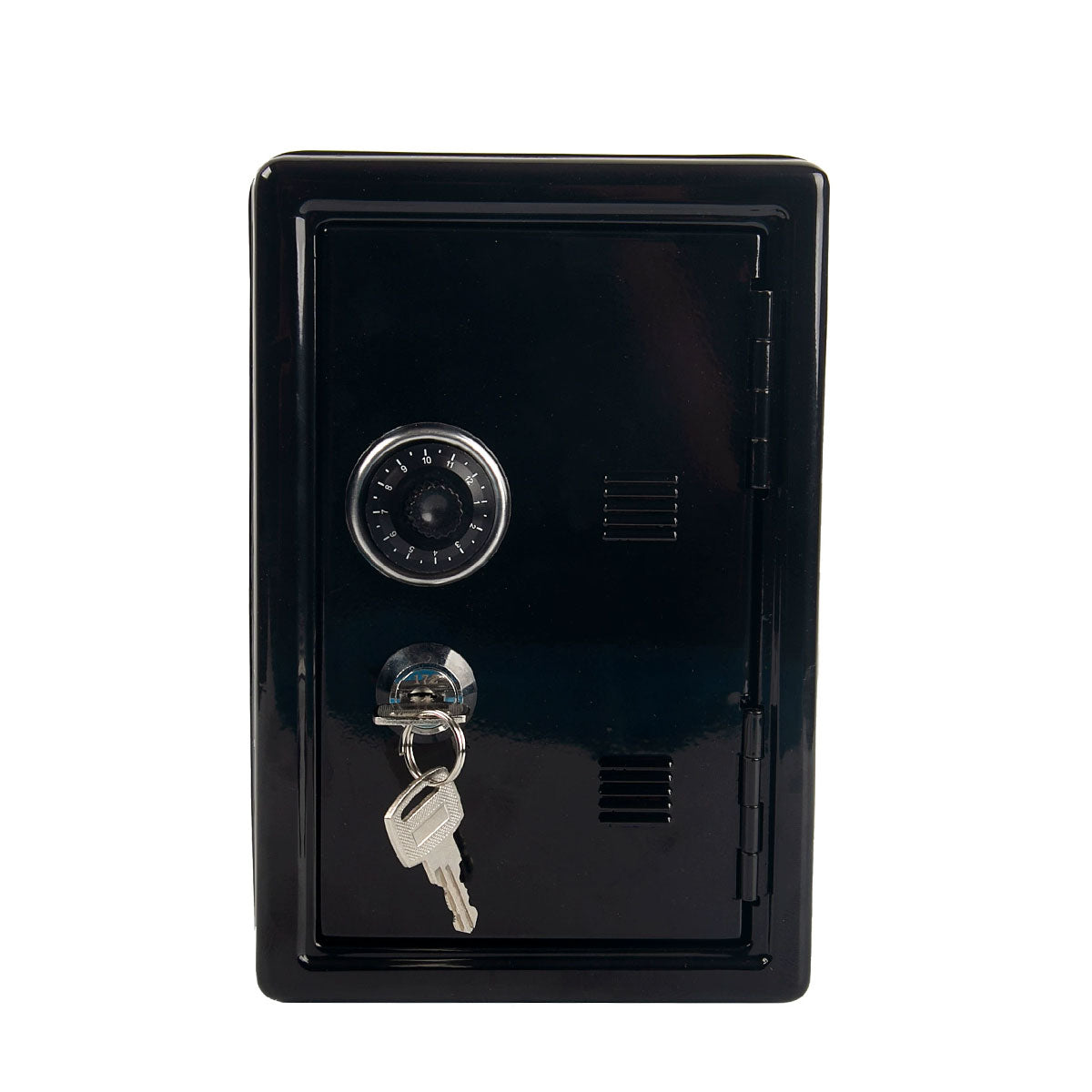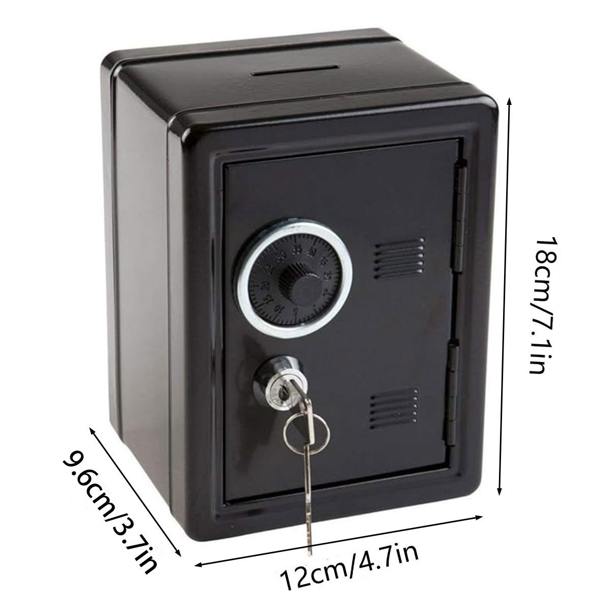- Miniature safe appearance with a decorative dial