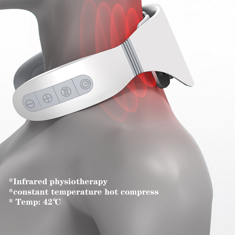 This neck massager features a lightweight design with a comfortable fit, providing effective relief for cervical discomfort and fatigue. It combines infrared physiotherapy and hot compress functions, offering multiple massage modes and adjustable levels for personalized comfort. The device supports intelligent operation through remote control or one-click AI voice broadcast, ensuring ease of use and safety with automatic power-off protection. Equipped with a built-in rechargeable battery, it allows for extended use and convenient portability.