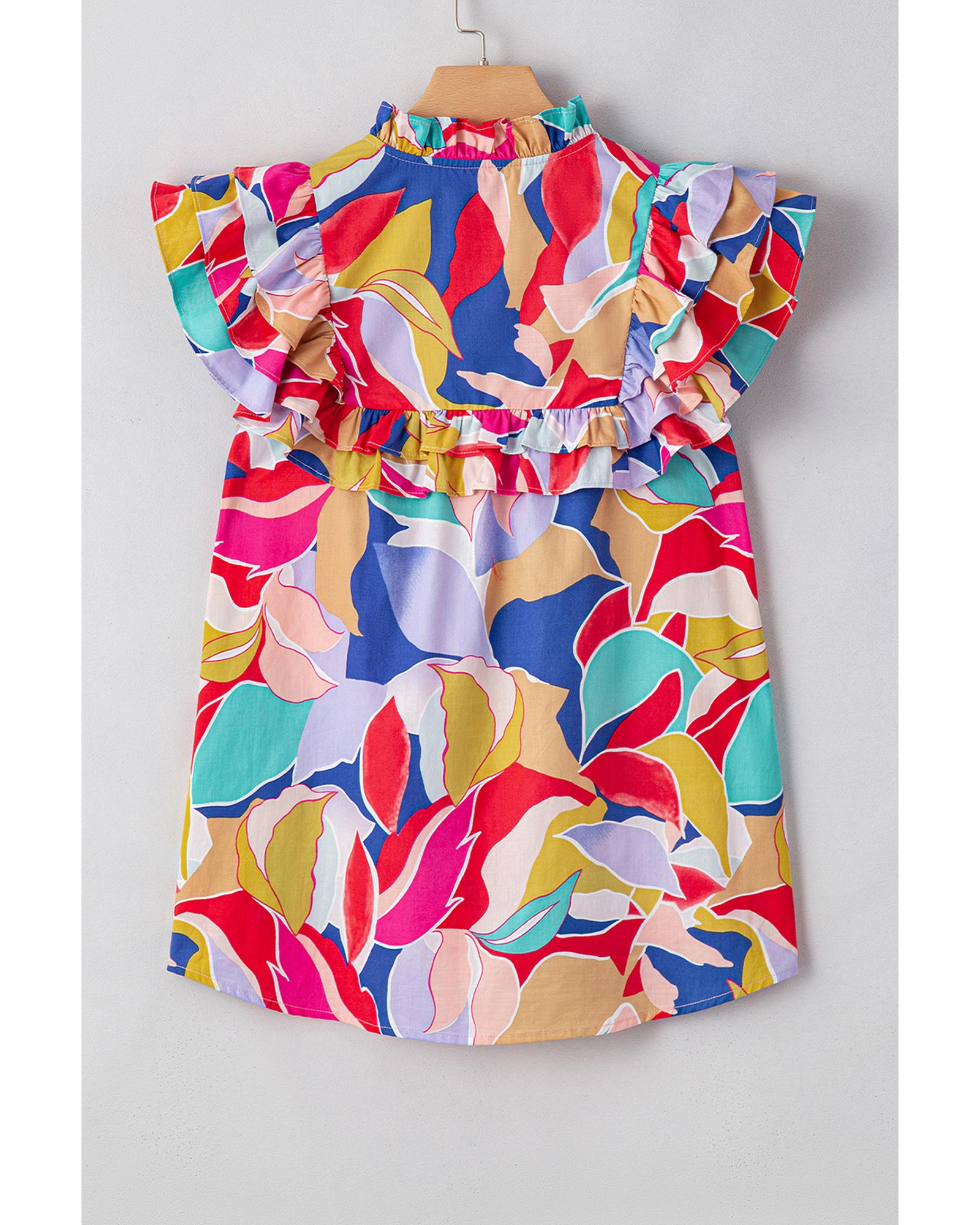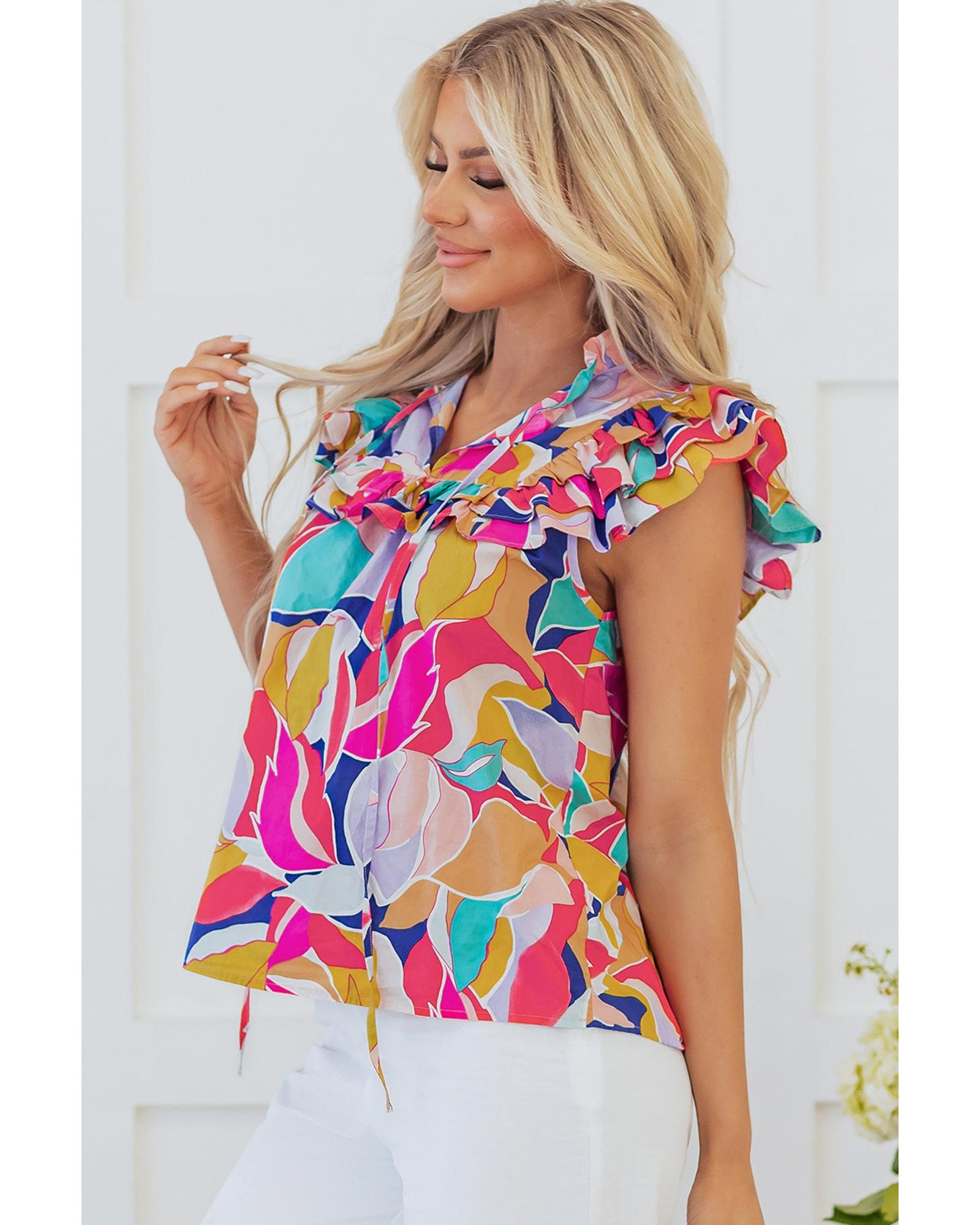This blouse features a stylish abstract print with feminine and playful details. Designed with a trendy fitted look, it offers a modern and artistic appearance suitable for various occasions. The design includes ruffled flutter sleeves and a tied split V-neck for a customizable fit, making it both fashionable and comfortable.