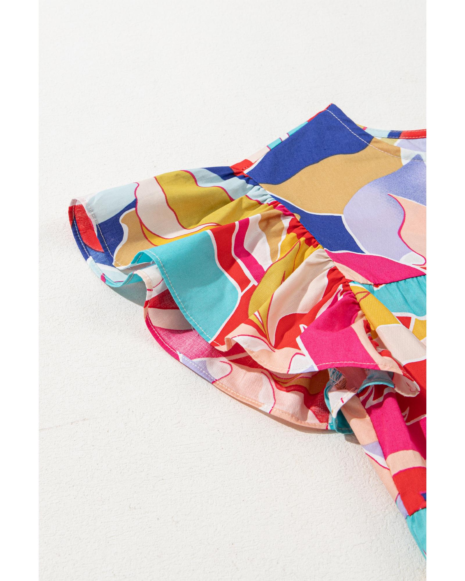 Pink Abstract Printed Ruffled Flutter Sleeve Tiered Mini Dress – XL