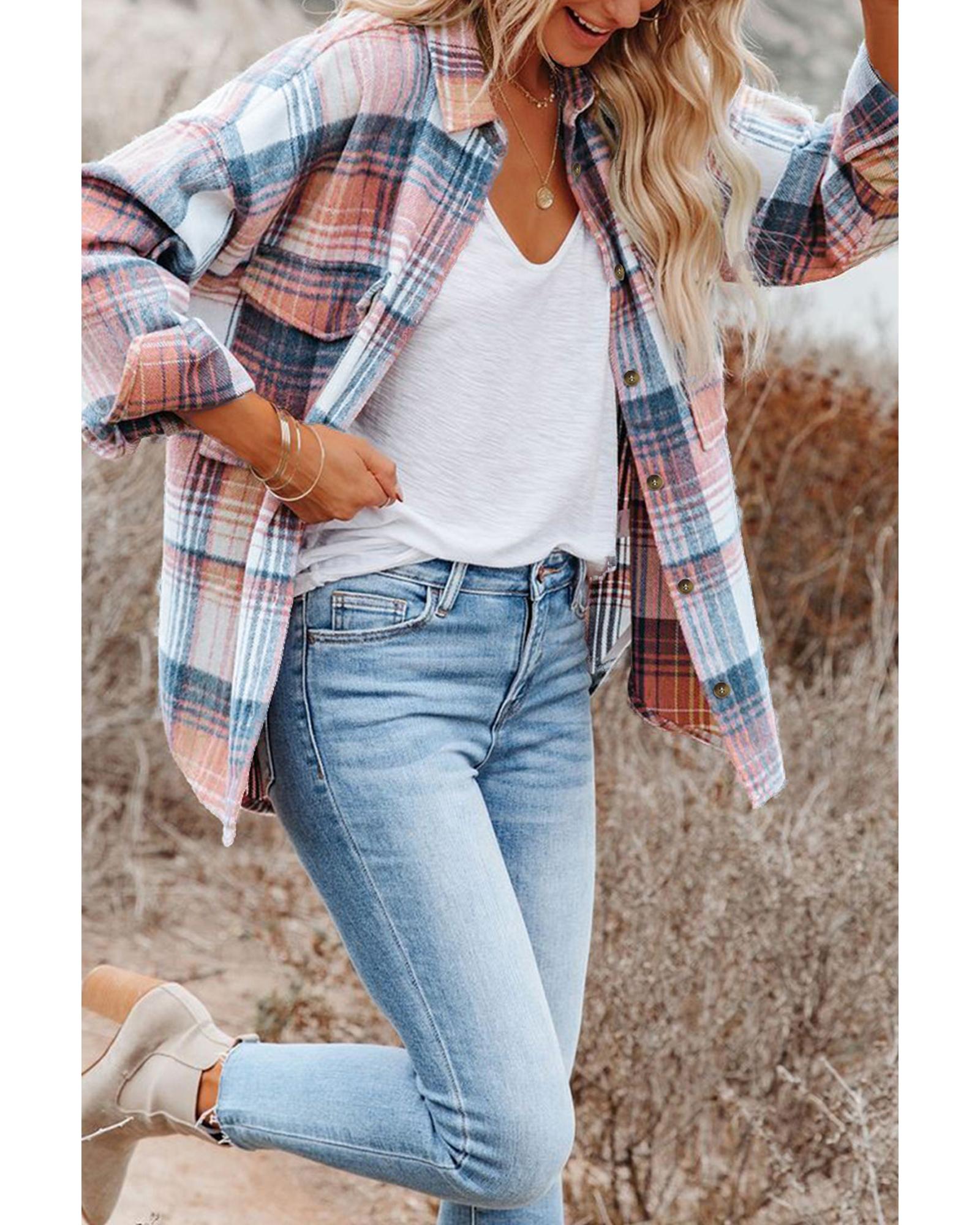 This stylish shacket features a trendy plaid design with flap pockets, making it a versatile addition to any wardrobe. Crafted from high-quality materials, it is suitable for both casual and dressy occasions, offering a fashionable and functional outerwear option.