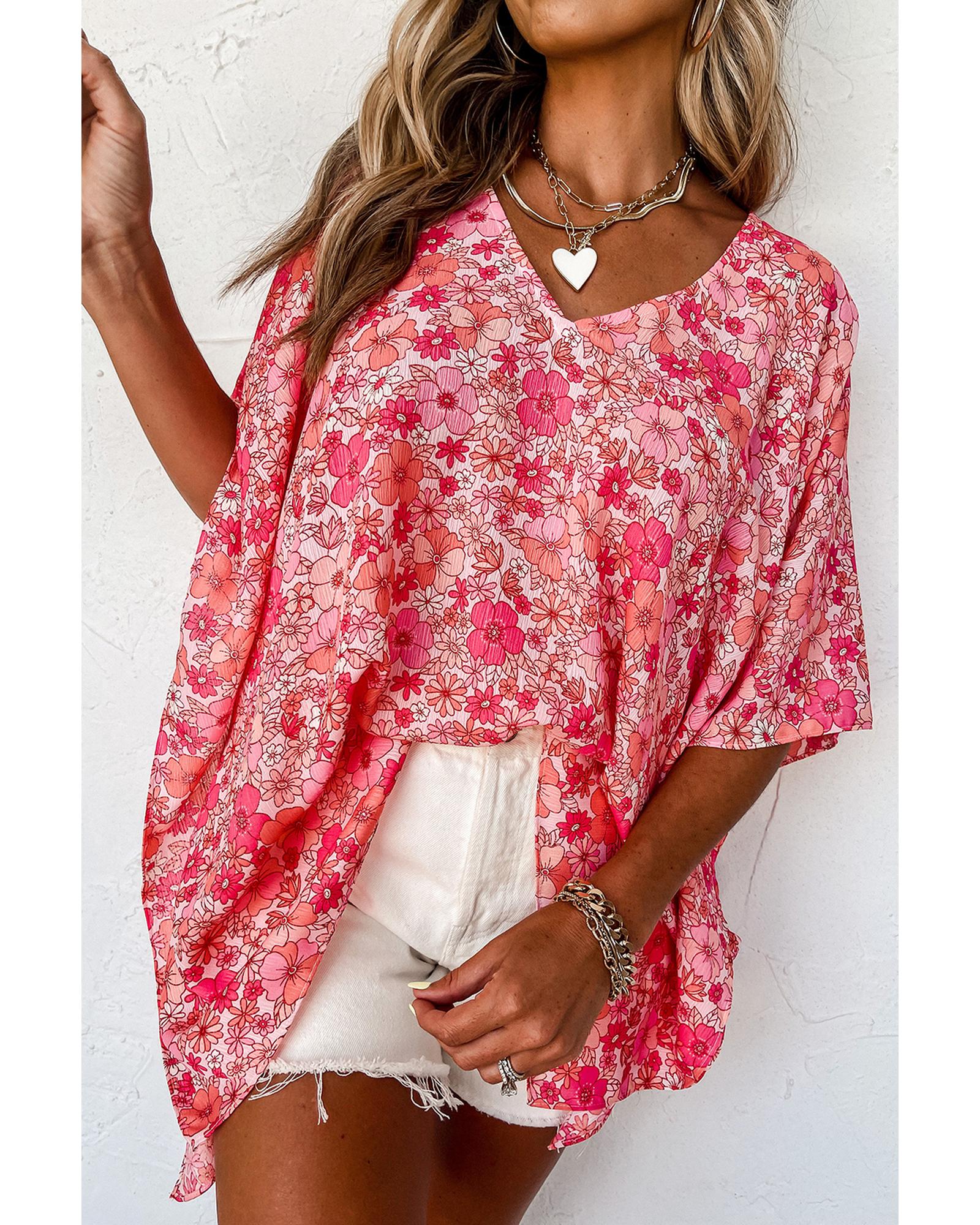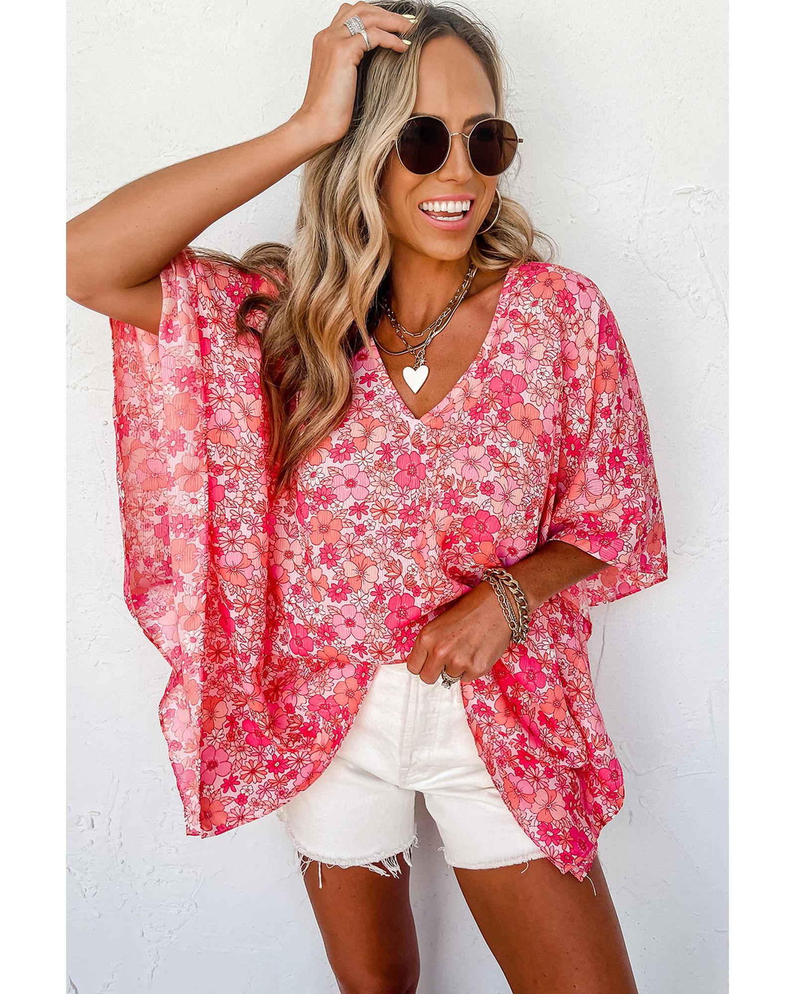 This blouse features a trendy boho floral design with a V neckline and kimono style, offering a chic and versatile look suitable for various outfits. Its oversized fit provides a comfortable and flattering silhouette, making it a stylish addition to any wardrobe.