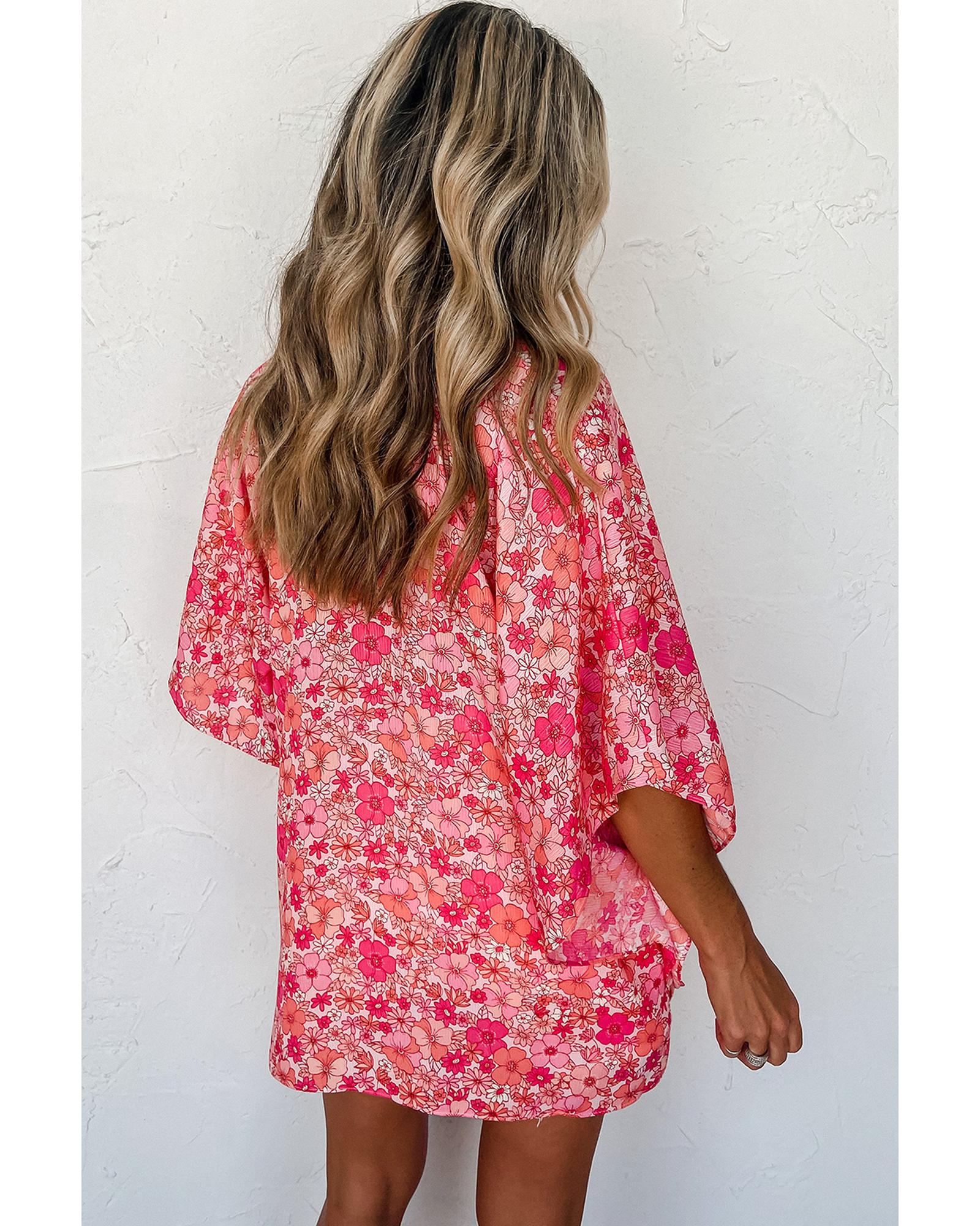 Pink Boho Floral V Neck Kimono Style Blouse – S