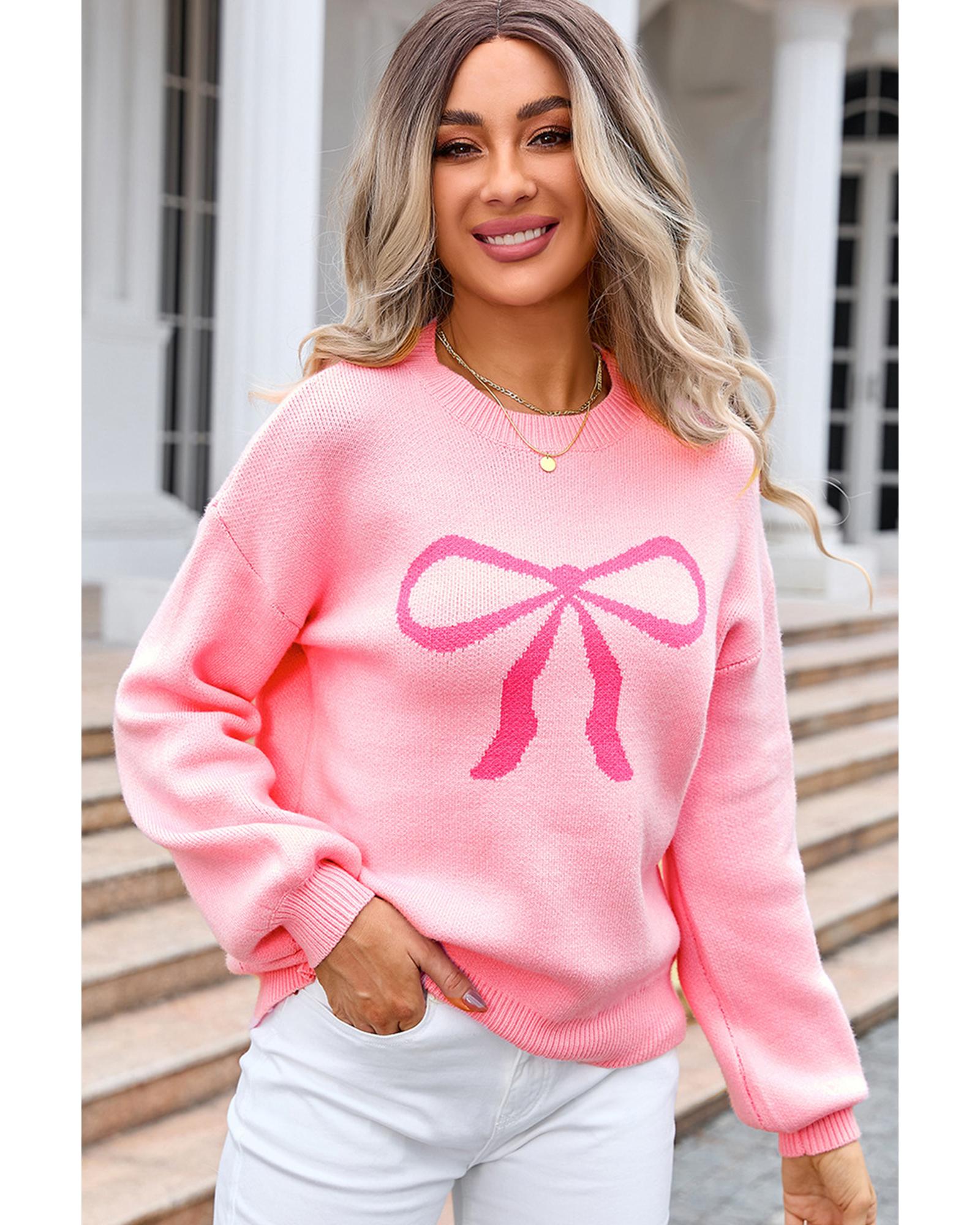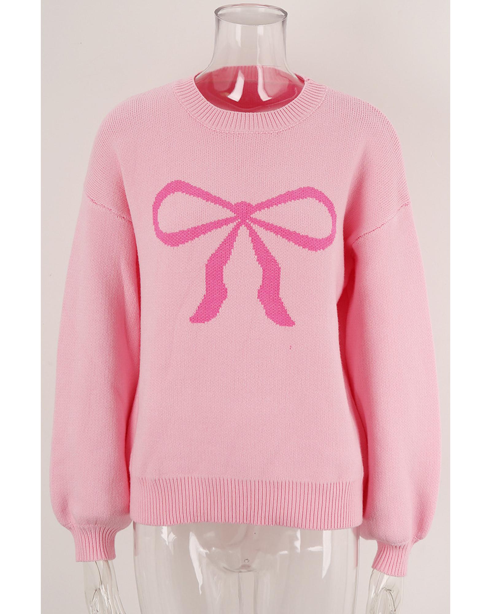 Pink Bow Graphic Drop Shoulder Round Neck Sweater – M