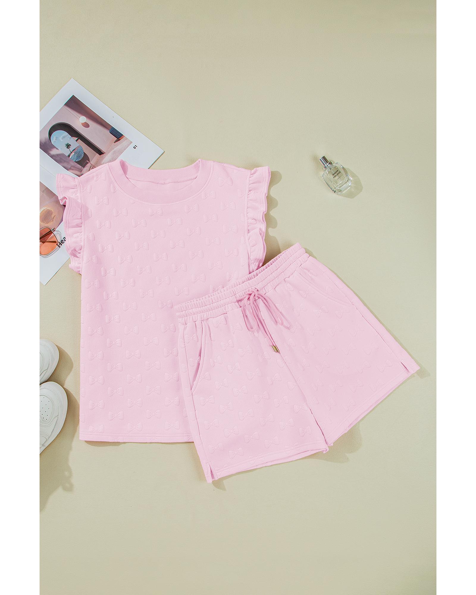 Pink Bow Jacquard Ruffle Sleeve Short 2pcs Outfit – M
