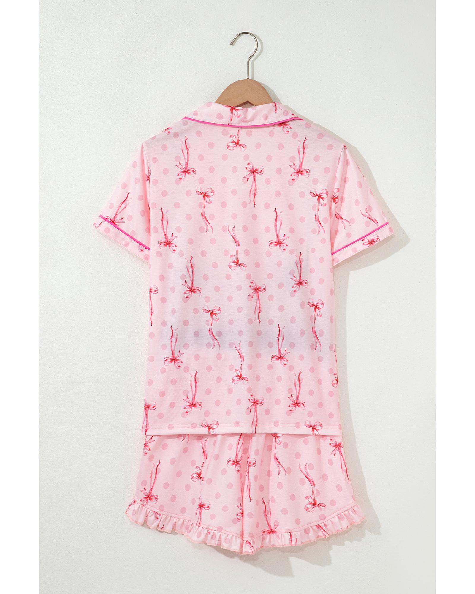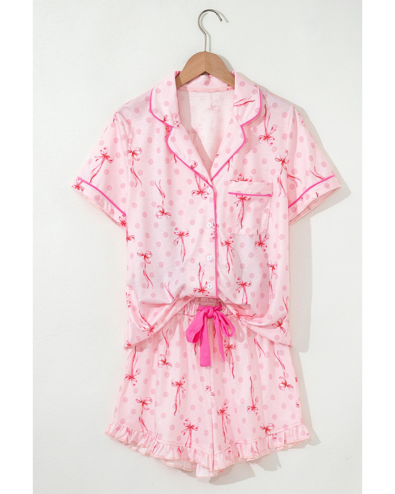Pink Bow Print Contrast Pipping Short Pajamas Set – L