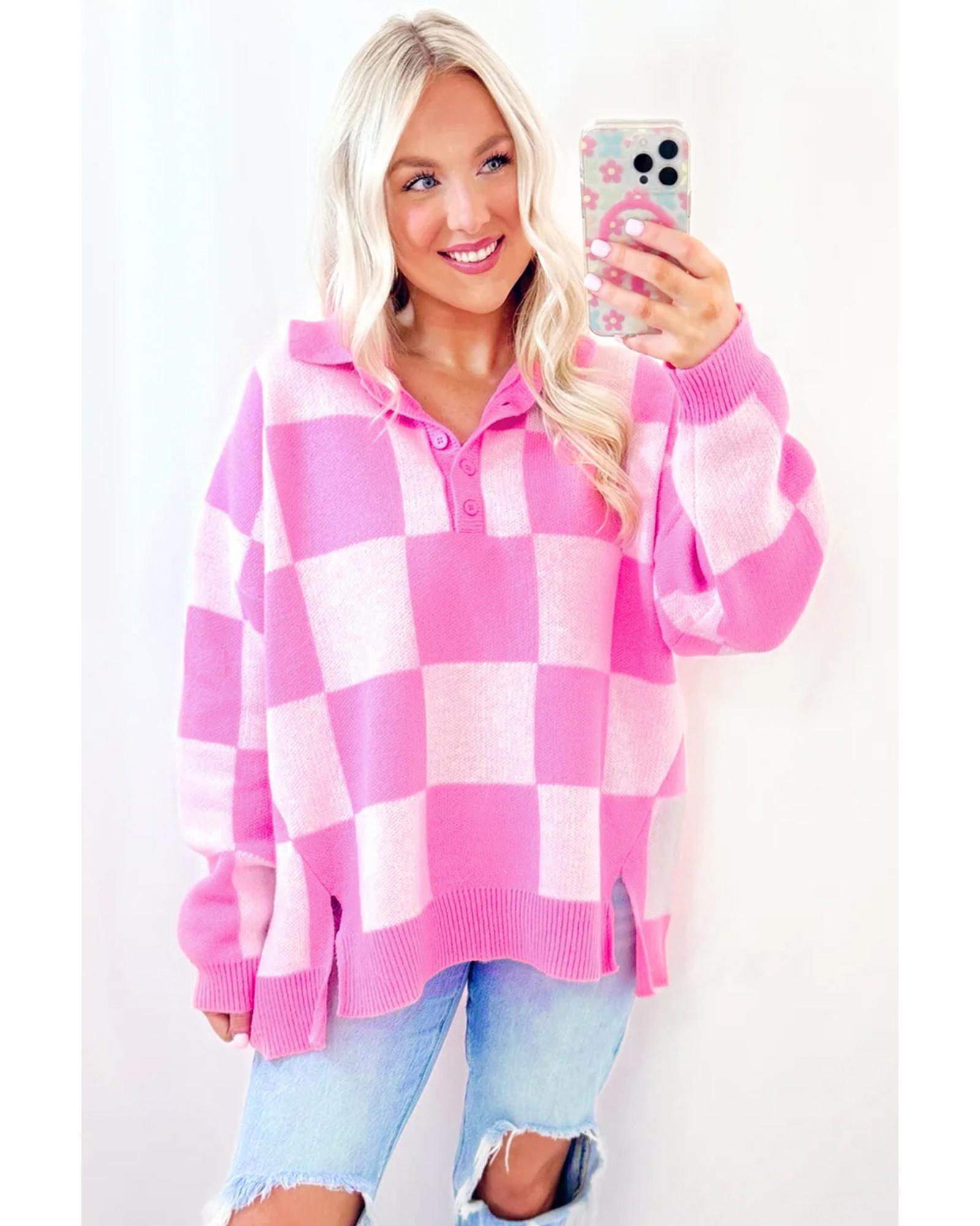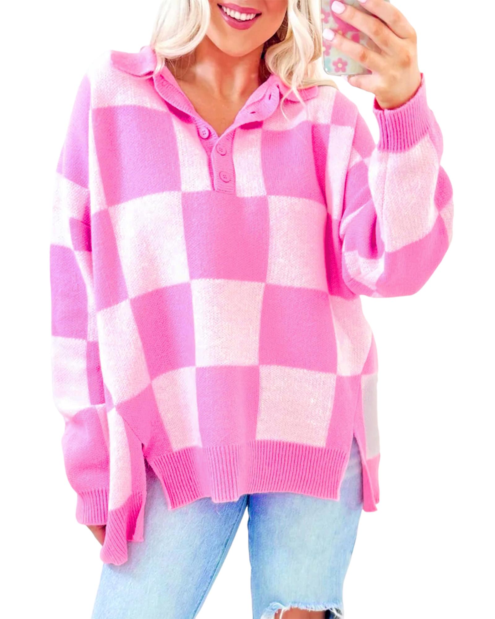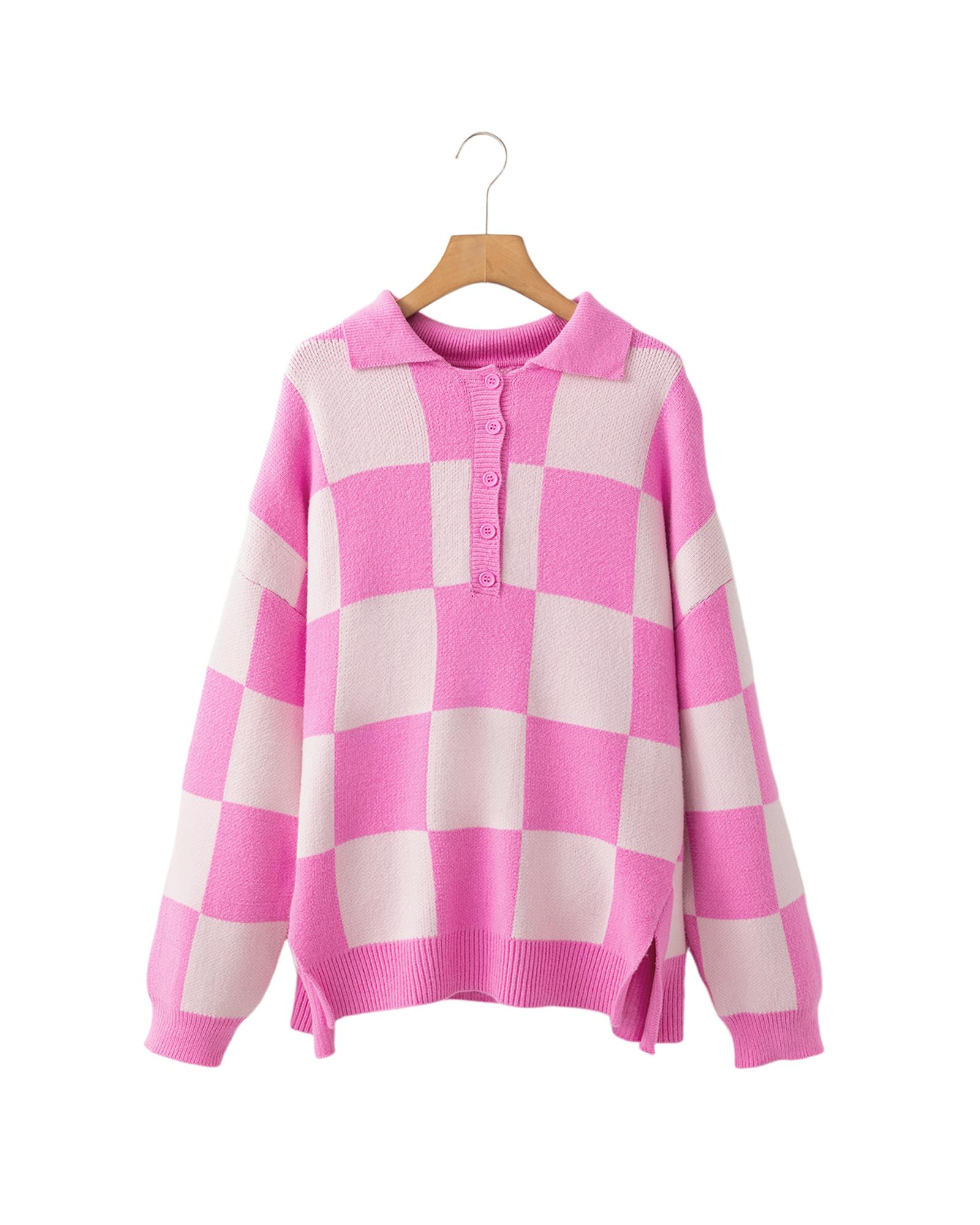 Pink Checkerboard Half Button Collared Drop Shoulder Sweater – M