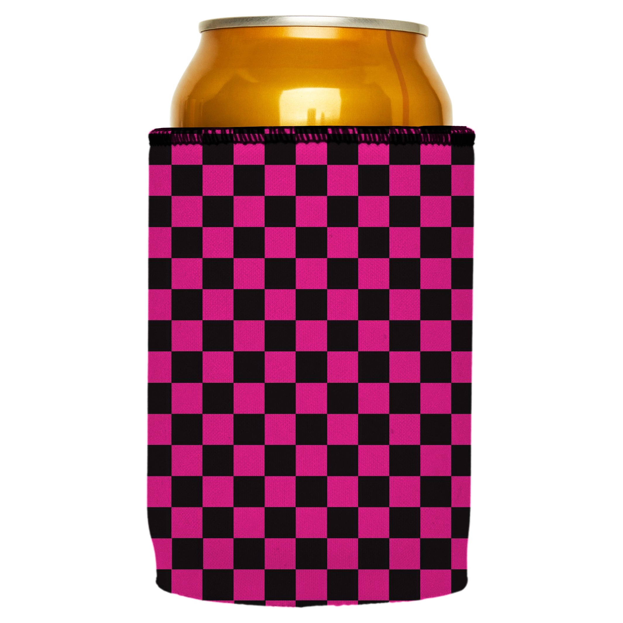 This stubby cooler features a vibrant pink and black checkerboard pattern, providing a stylish way to keep your cans and bottles cold. Its retro design adds a fun and eye-catching element to any party or gathering, making it both functional and fashionable.
