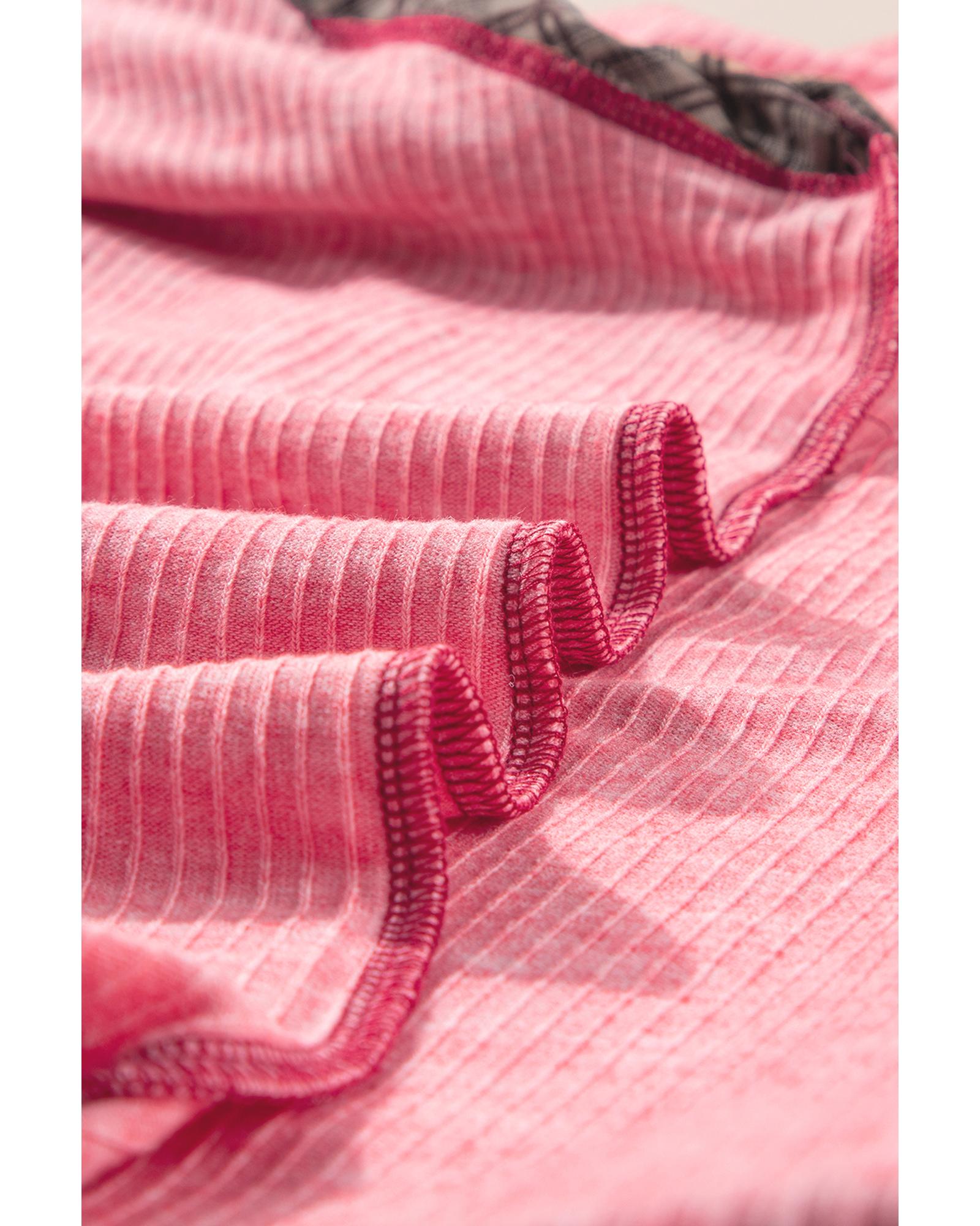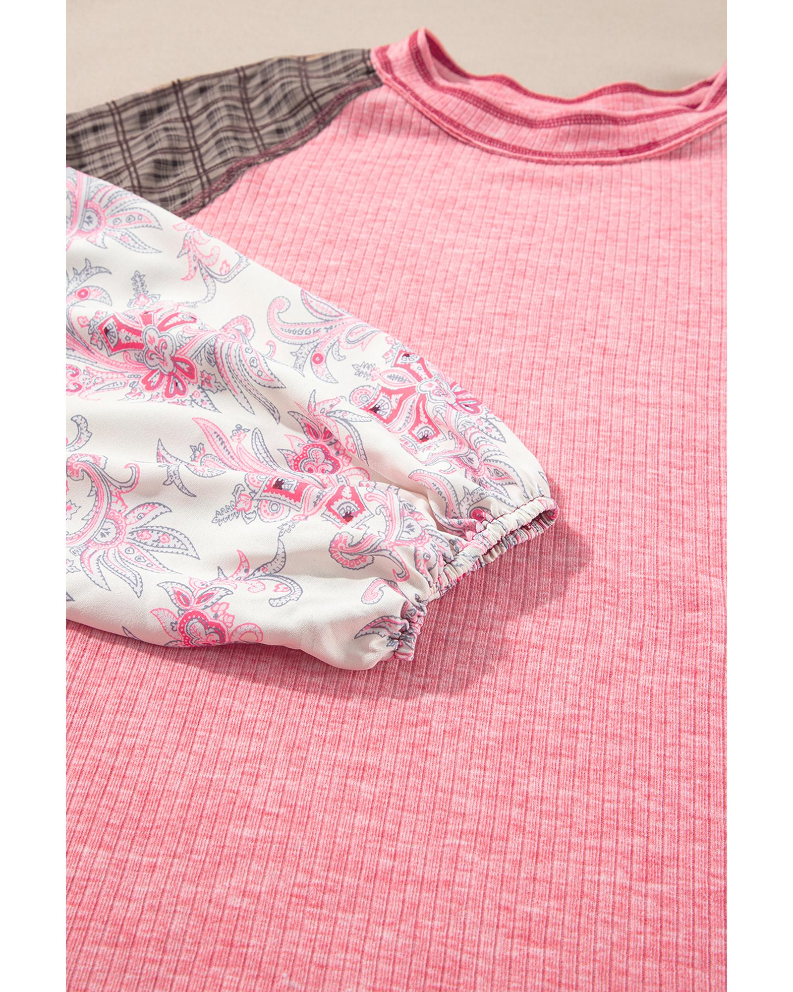 Pink Checkered Paisley Patchwork Raglan Sleeve Seamed Plus Size Top – 3X