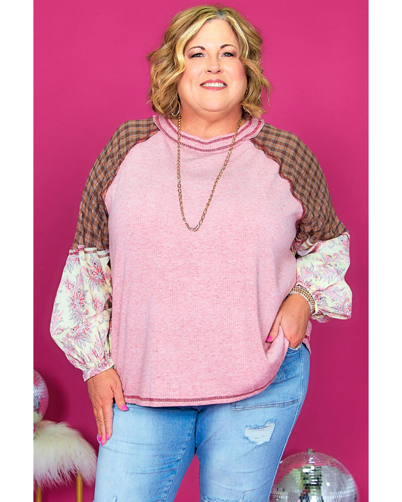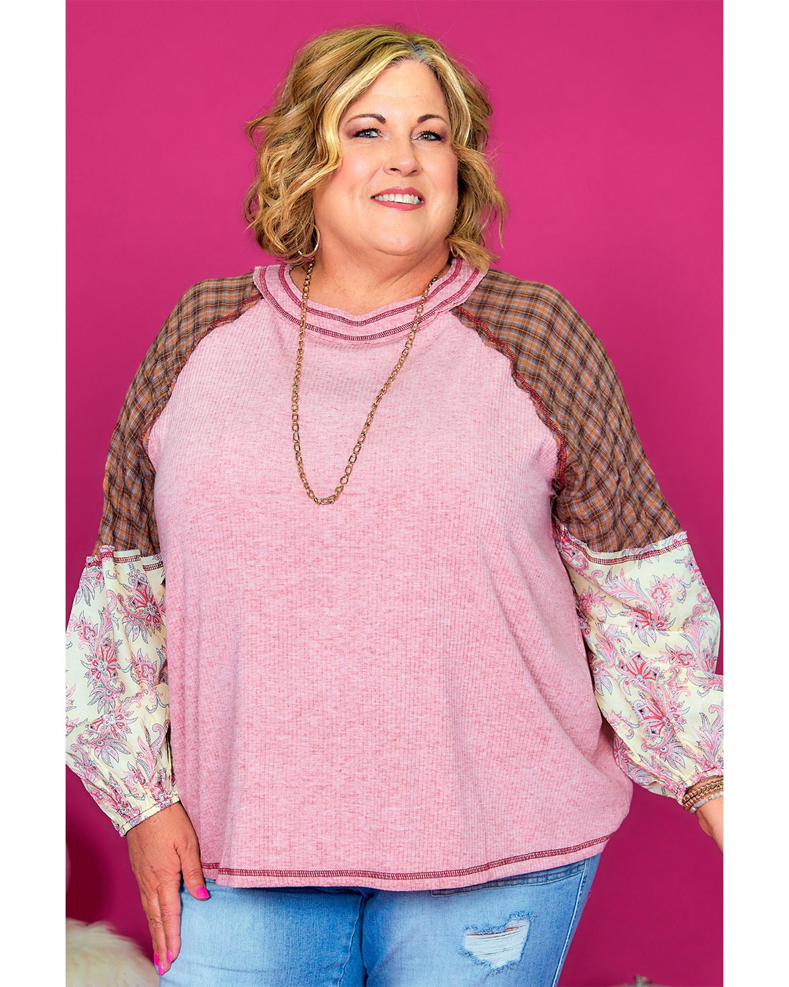 Pink Checkered Paisley Patchwork Raglan Sleeve Seamed Plus Size Top - 2X