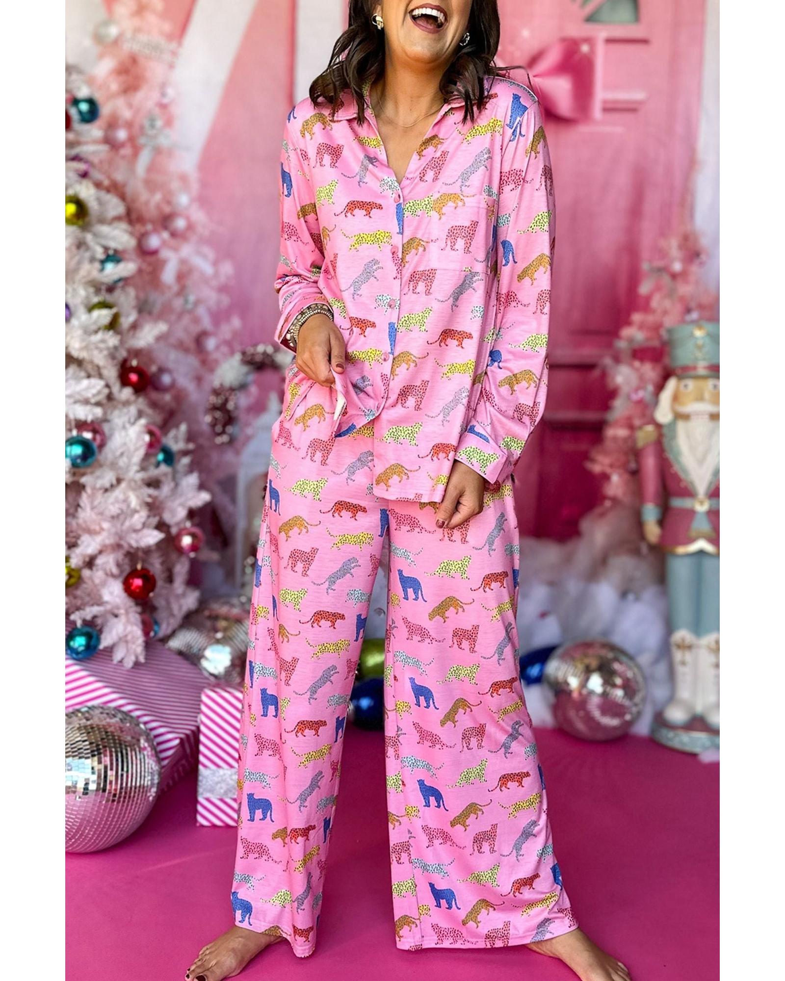 This pajama set features a trendy cheetah print design, combining style and comfort for a relaxed night??s sleep or lounging at home. The set includes a matching shirt and pants, offering a cozy and fashionable option for various occasions.