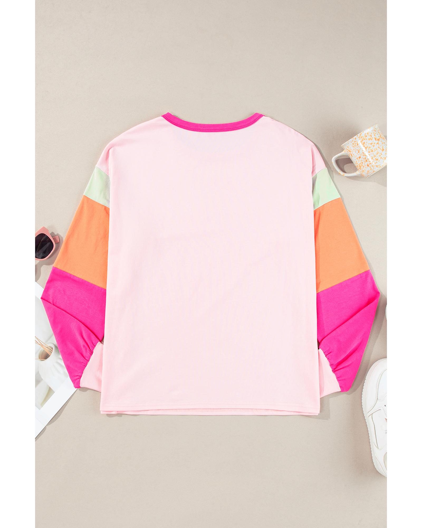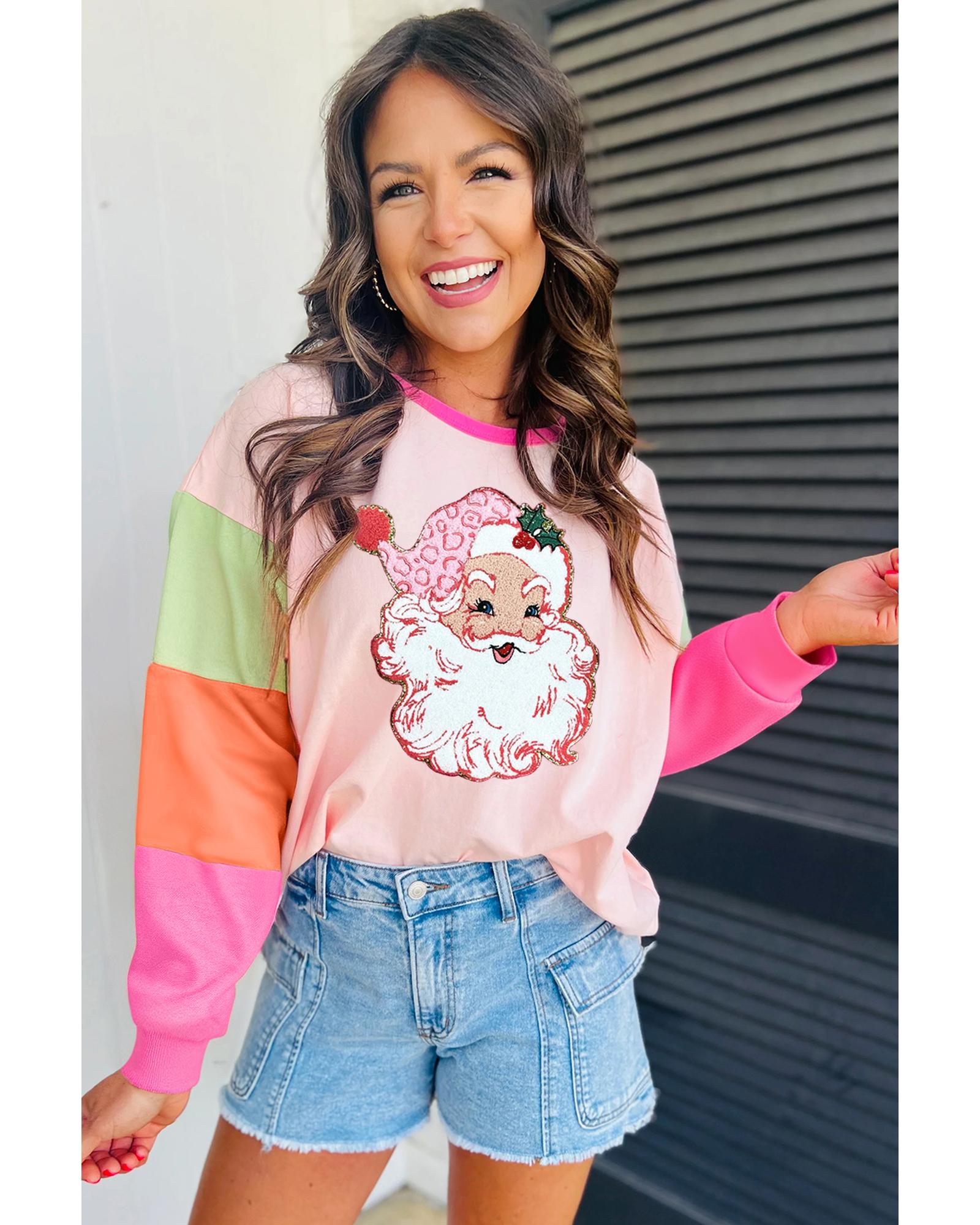 This festive top features a vibrant colorblock design with a cheerful Santa Claus graphic, making it perfect for holiday celebrations. It combines a stylish look with comfortable wear, suitable for various casual occasions during the holiday season.