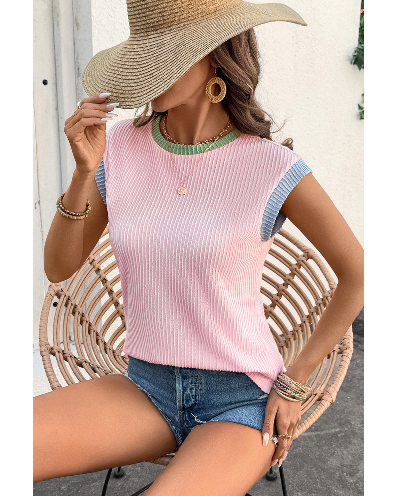 This pink color block corded knit crew neck tee offers a stylish and comfortable option for casual wear. Its unique design features a contrast trim that creates a striking colorblock effect, complemented by wide cap sleeves for a romantic and cool appearance. Made from a soft corded knit fabric, it is ideal for pairing with denim shorts and sandals for a relaxed, fashionable look.