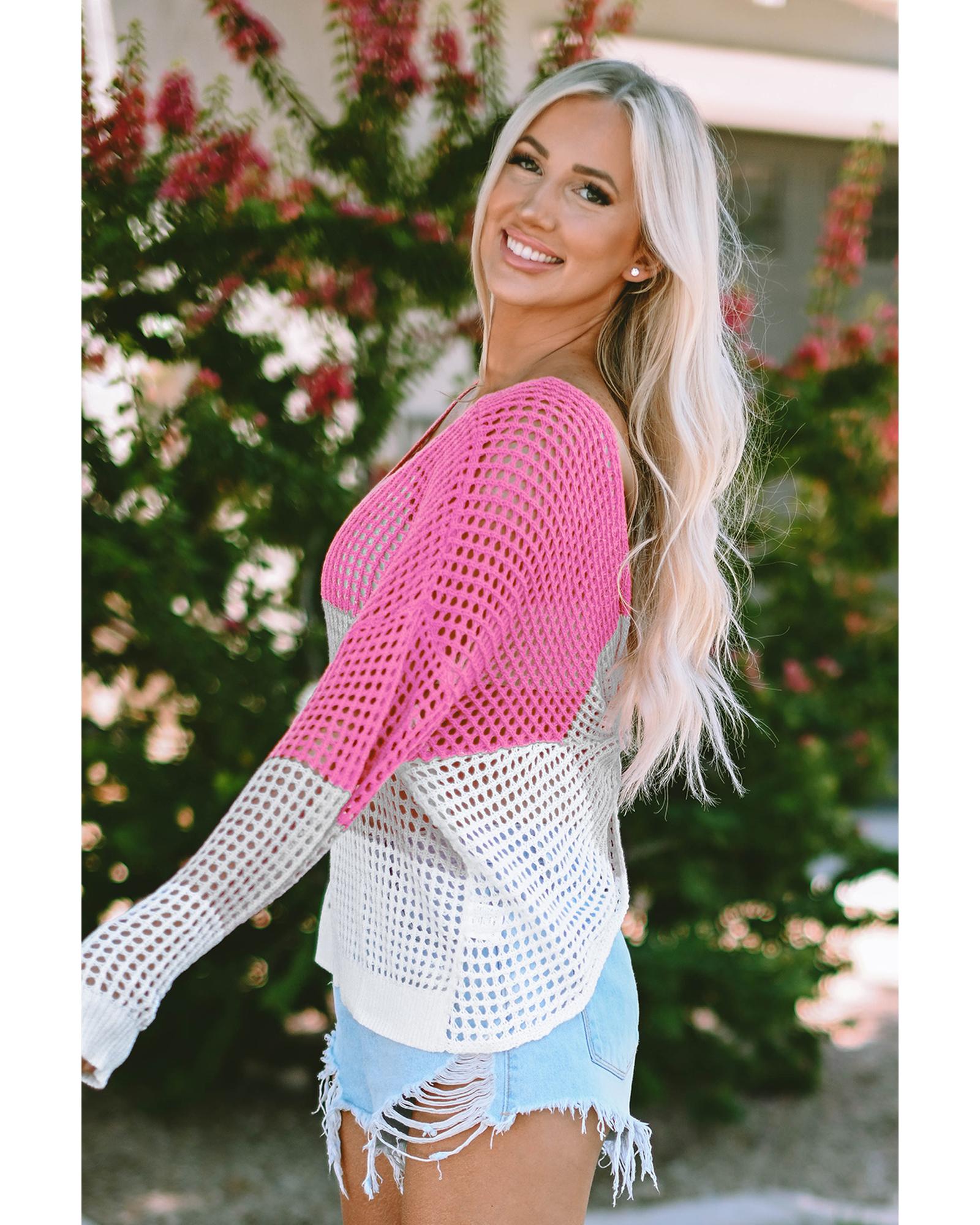 This pink color block eyelet long sleeve twisted back knit top offers a trendy and fitted look suitable for various styling options. Designed with a modern aesthetic, it features eyelet details and a twisted back design, making it a versatile addition to your wardrobe.