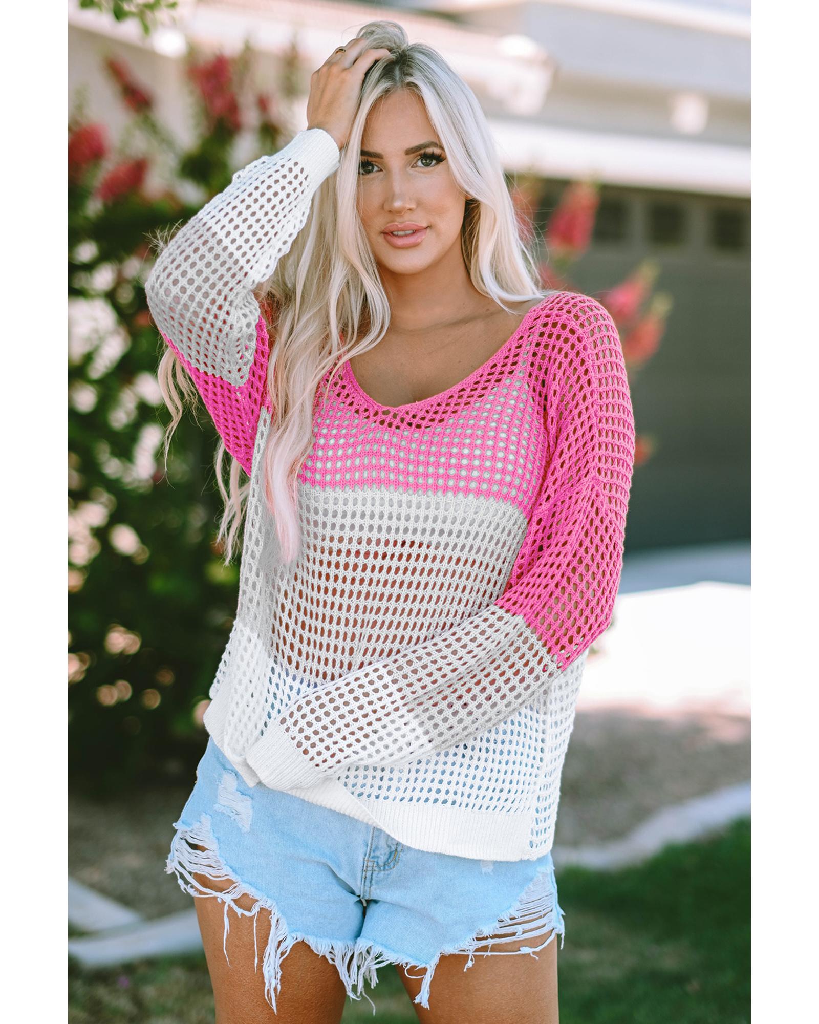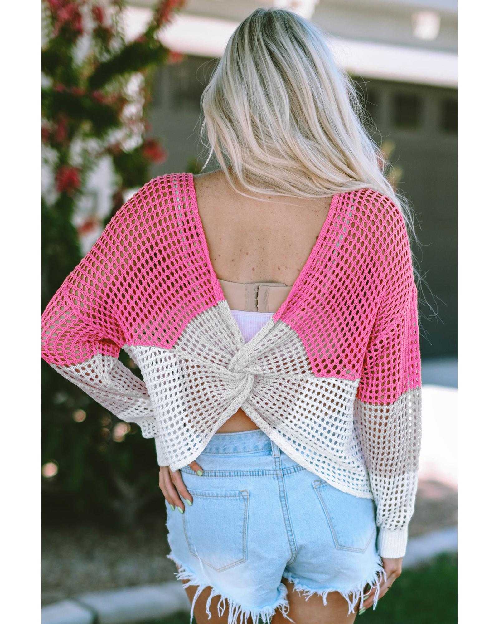 Pink Color Block Eyelet Long Sleeve Twisted Back Knit Top – XL