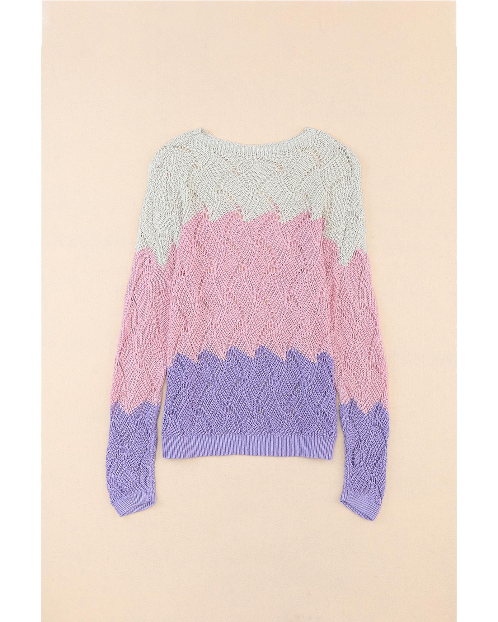 Pink Color Block Hollow Knitted Loose Sweater – M