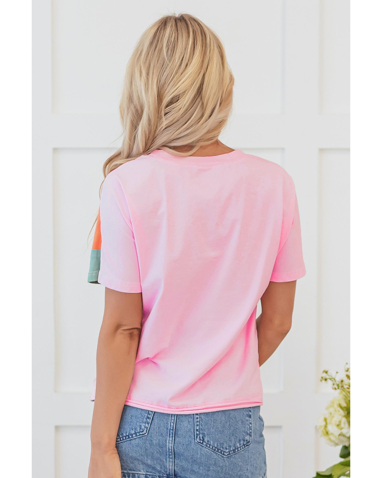 Pink Color Block Patchwork Seamed Crewneck T Shirt – L