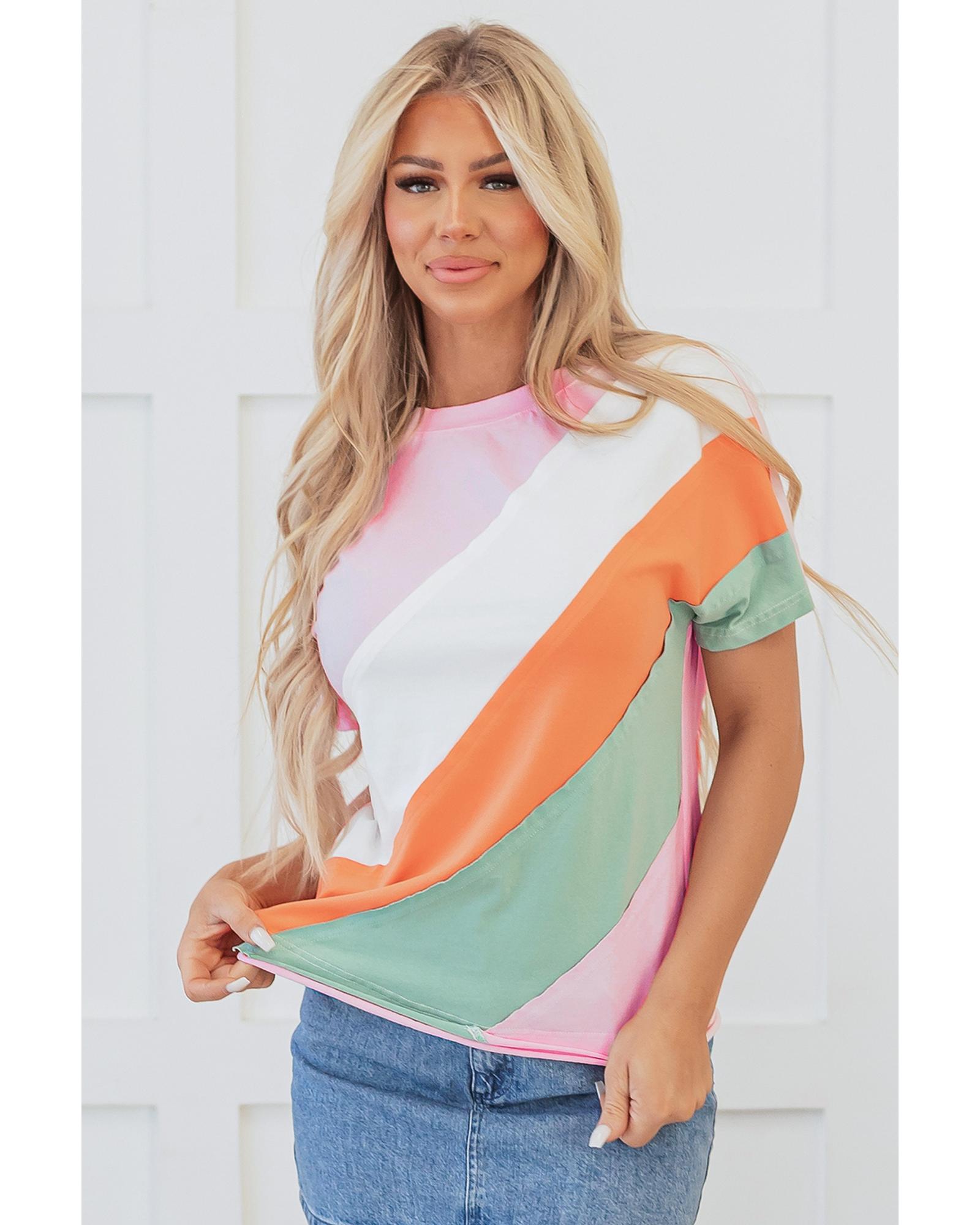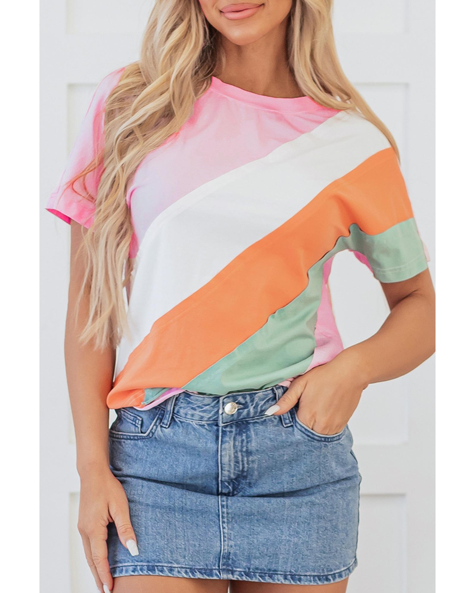 This Pink Color Block Patchwork Seamed Crewneck T Shirt offers a vibrant and playful design with contrasting color blocks and unique patchwork details. Its classic crew neck and short sleeves make it suitable for casual, everyday wear, providing both comfort and style.