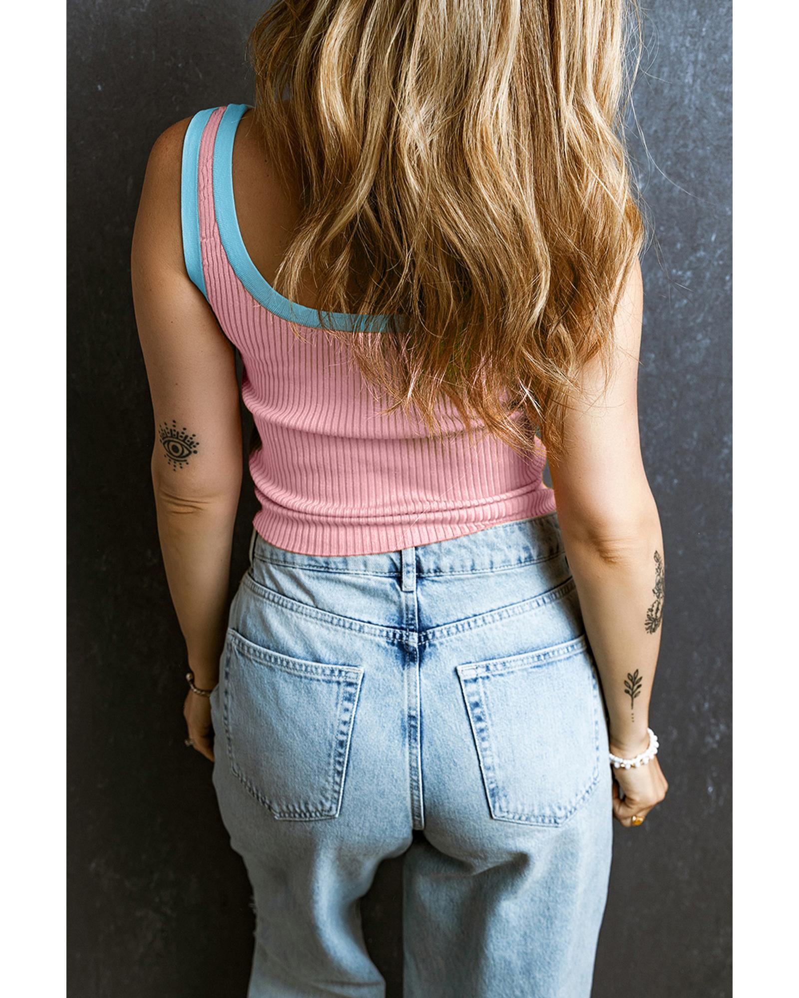 This pink colorblock edge ribbed knit U-neck tank top offers a stylish and trendy fitted look, perfect for casual or chic outfits. Designed with comfort and fashion in mind, it features a ribbed knit texture and a classic U-neck style that complements various looks.
