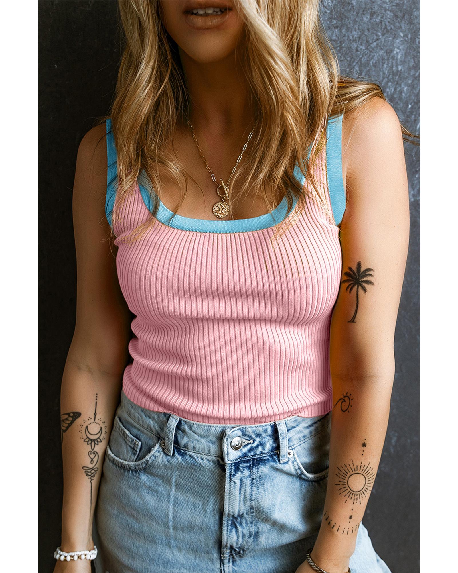 Pink Colorblock Edge Ribbed Knit U Neck Tank Top – L