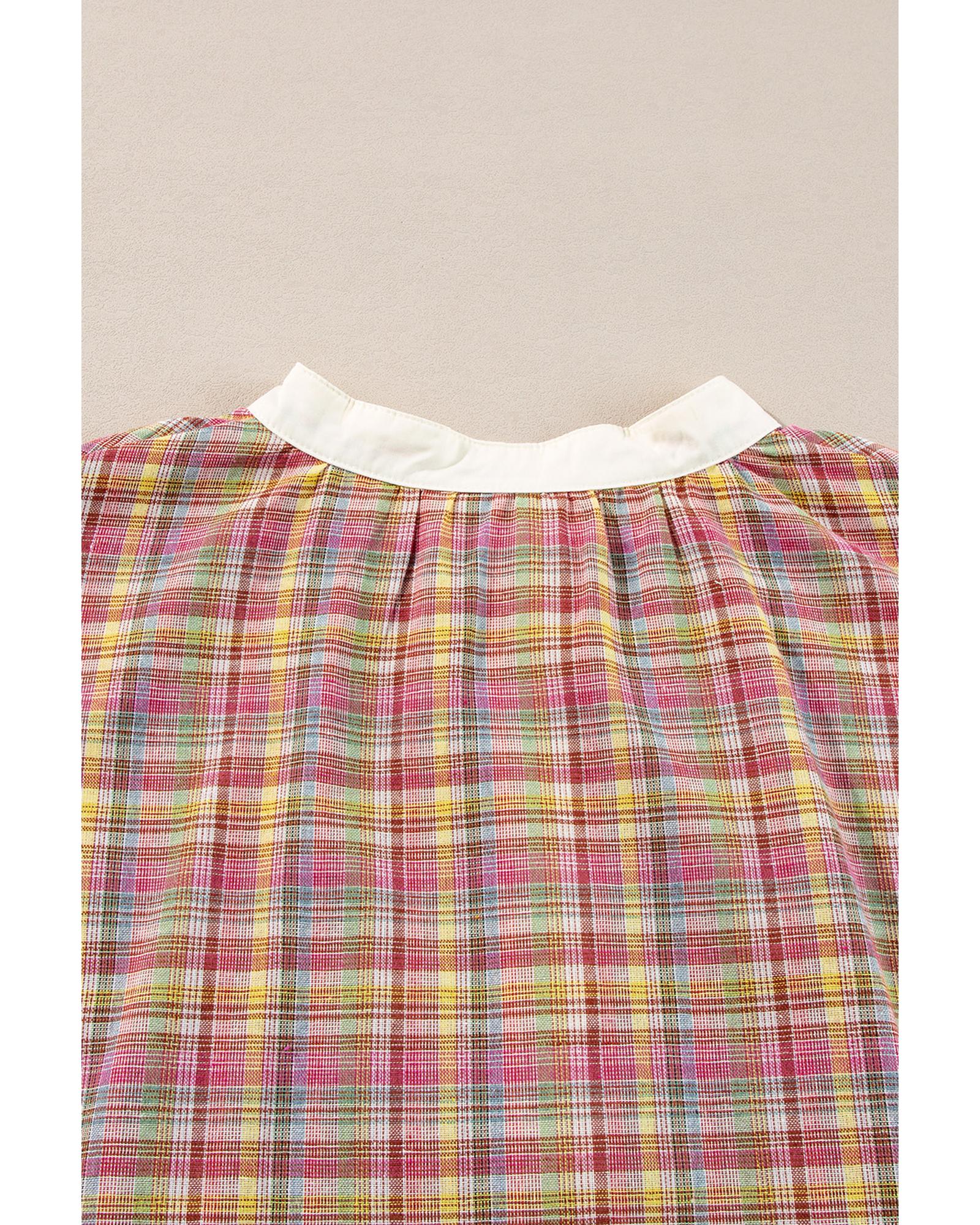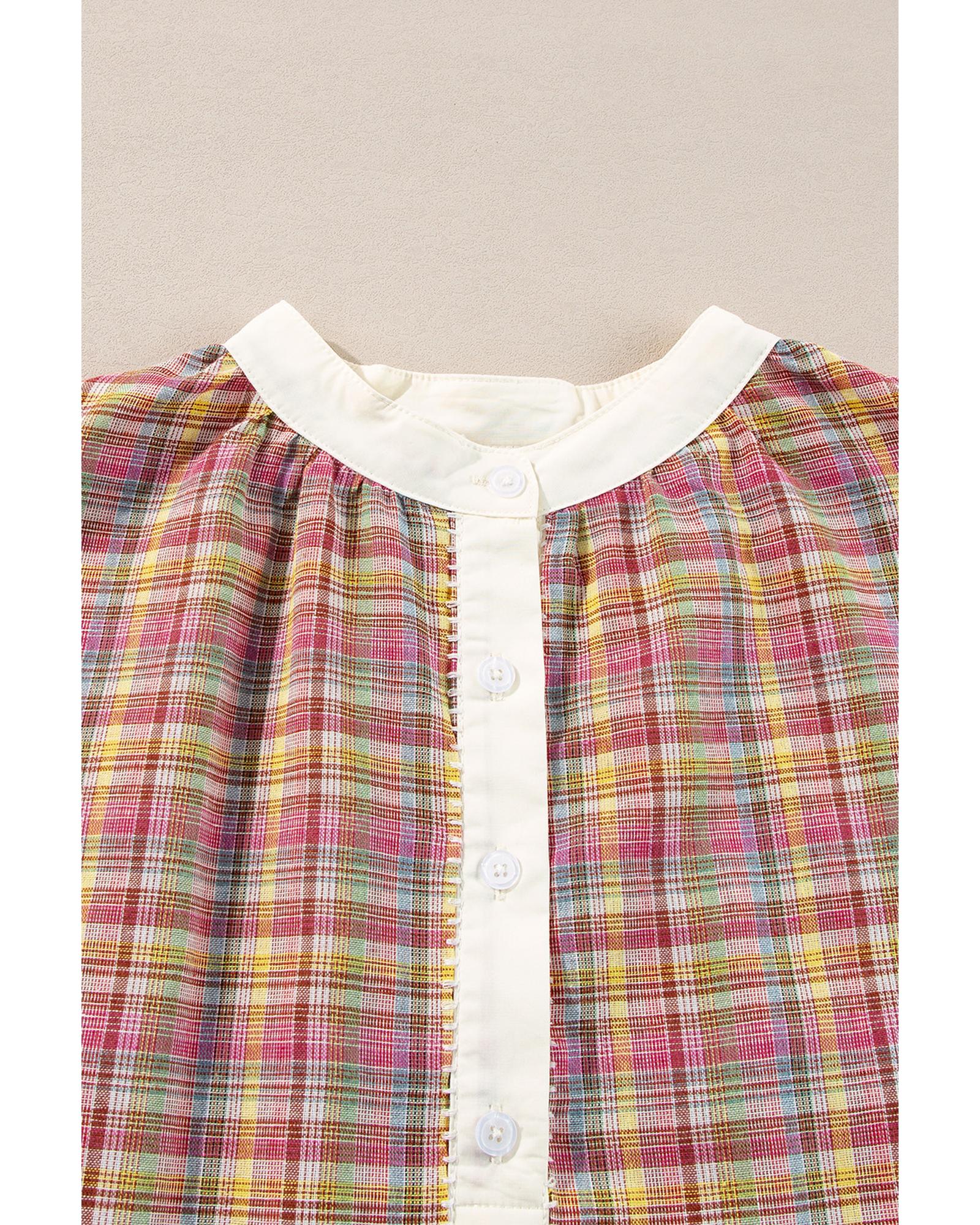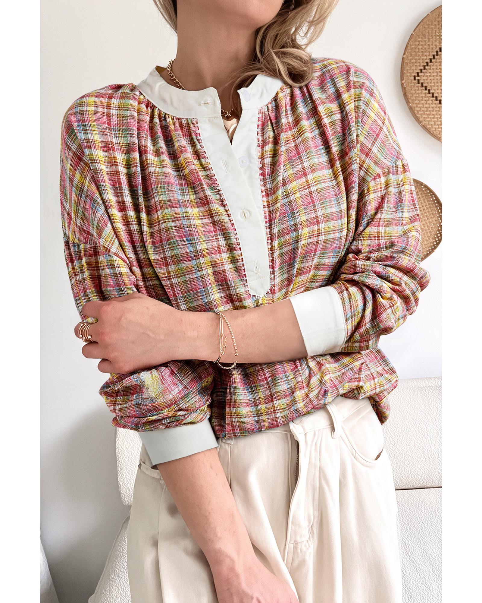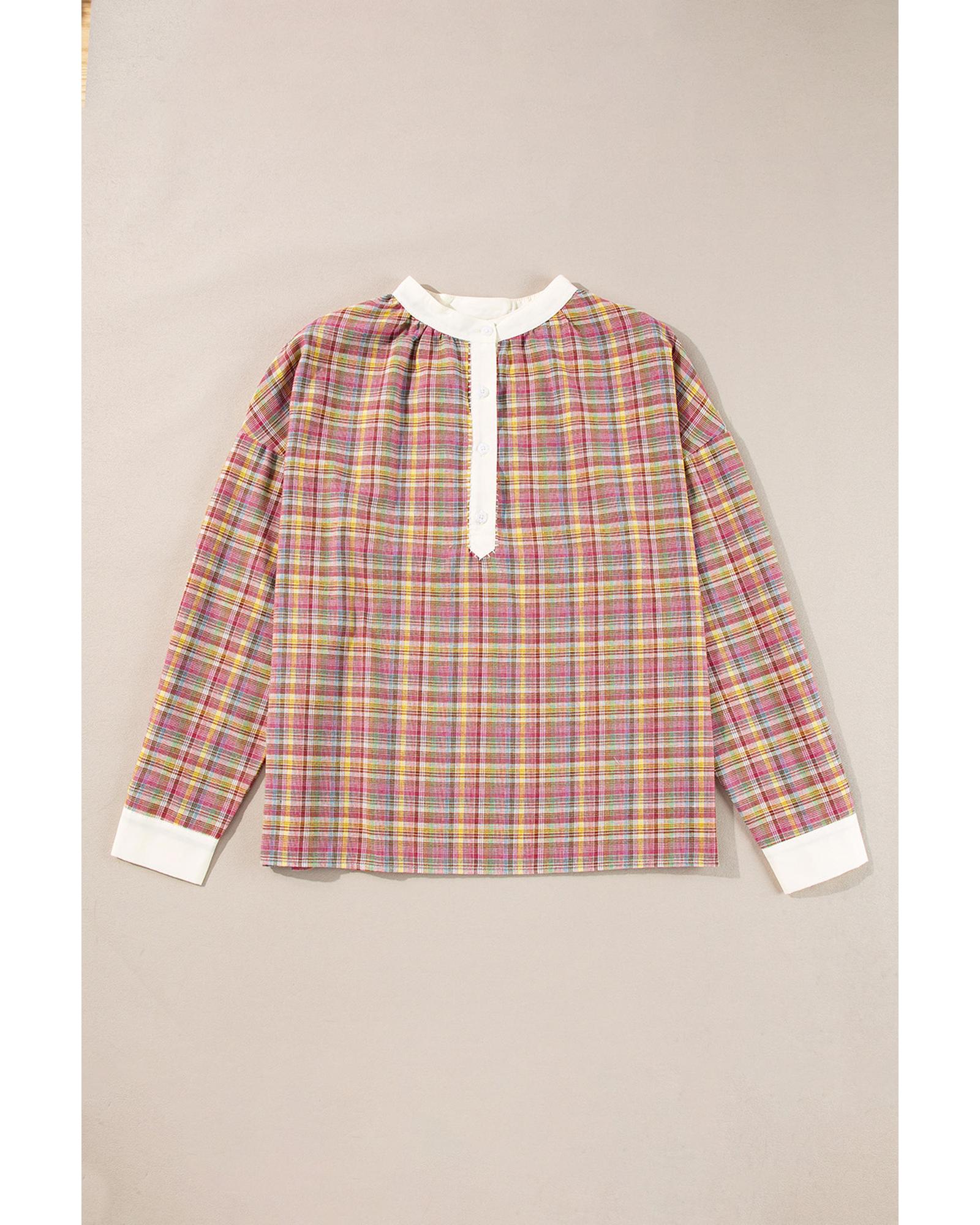 Pink Colorblock Plaid Patchwork Henley Blouse – XL