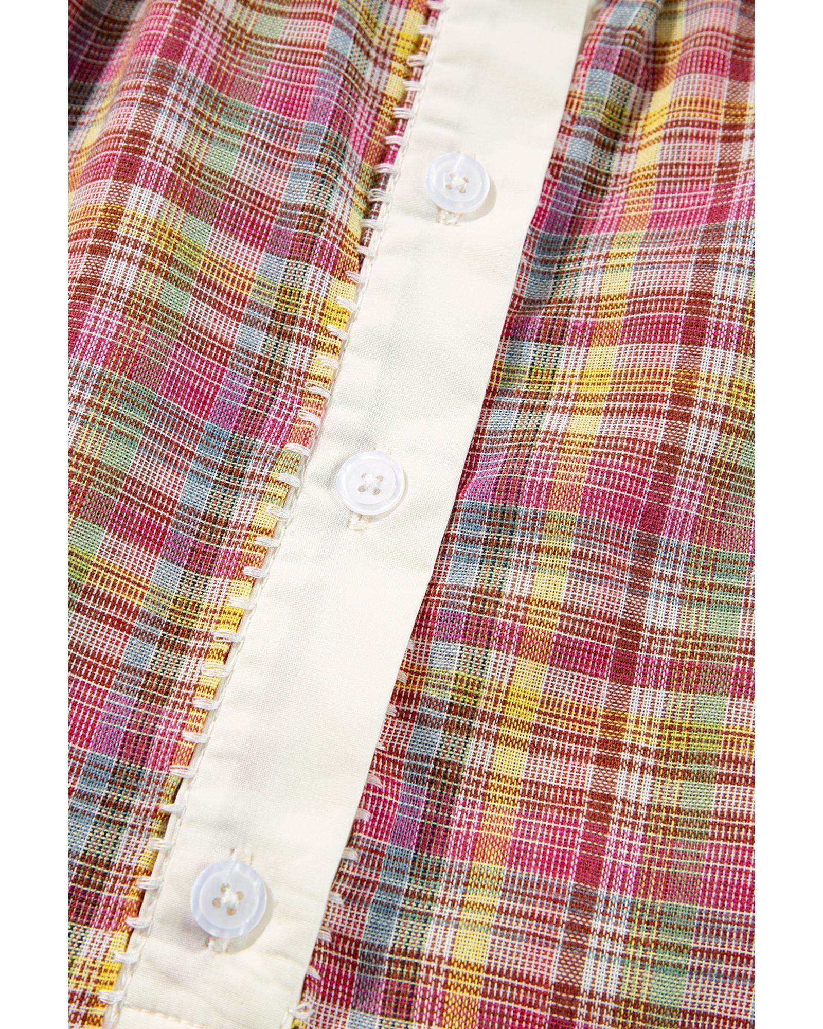 This blouse features a vibrant plaid patchwork design with a stylish colorblock pattern. It offers a trendy fitted look that can be dressed up or down, making it suitable for various occasions. The blouse combines comfort and style effortlessly, allowing for easy movement and a sophisticated appearance.