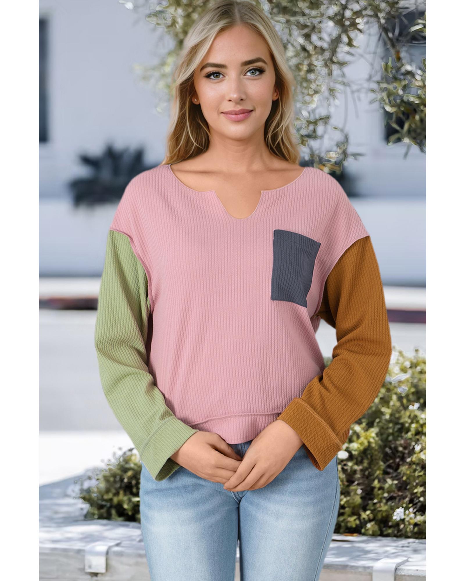 This pink colorblock ribbed textured long sleeve top combines a trendy fitted style with a comfortable loose fit. Its ribbed design and notched neckline add fashionable details, making it a versatile piece suitable for various outfits and occasions. Ideal for fall and winter wear, it pairs well with shorts, jeans, leggings, or skirts.