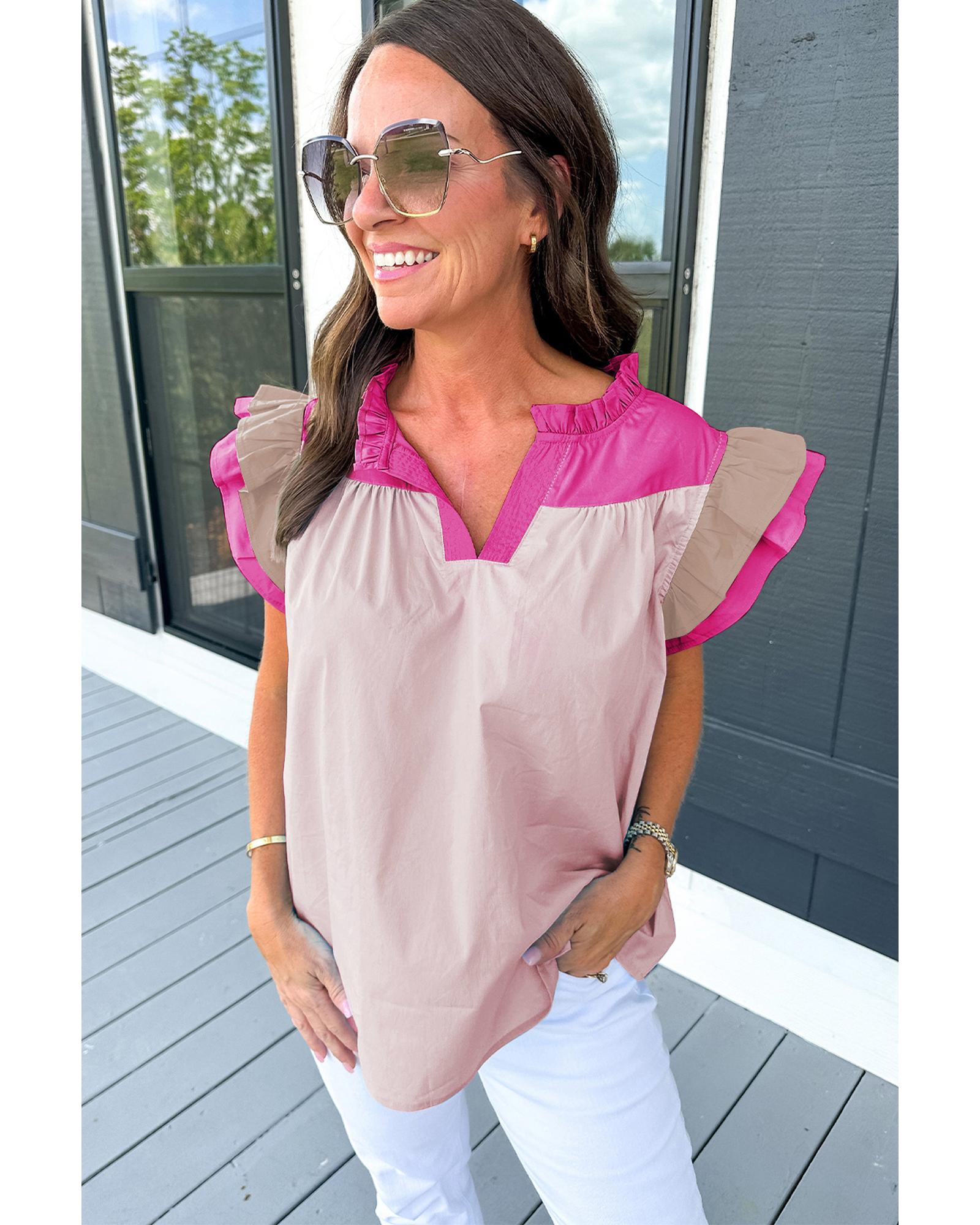 This blouse features a trendy pink colorblock design with ruffled sleeves and a frill V-neck, making it a stylish addition to any wardrobe.