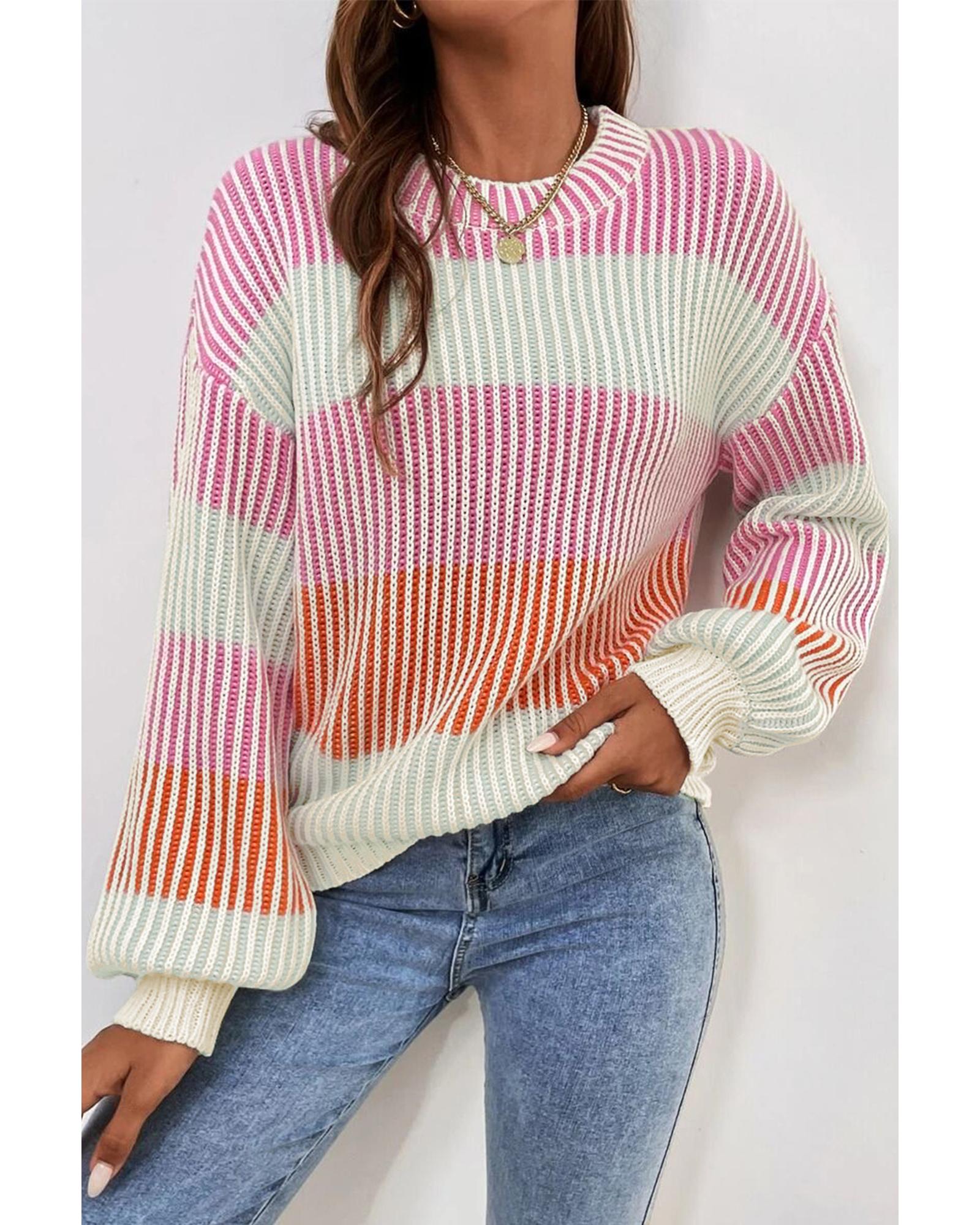 This pink colorblock textured knit sweater features a modern design with playful bubble sleeves and a classic crew neck. Made from cozy, stylish textured knit material, it offers a trendy fitted look suitable for various occasions. The sweater is available in multiple sizes and provides medium to high elasticity for a comfortable fit.