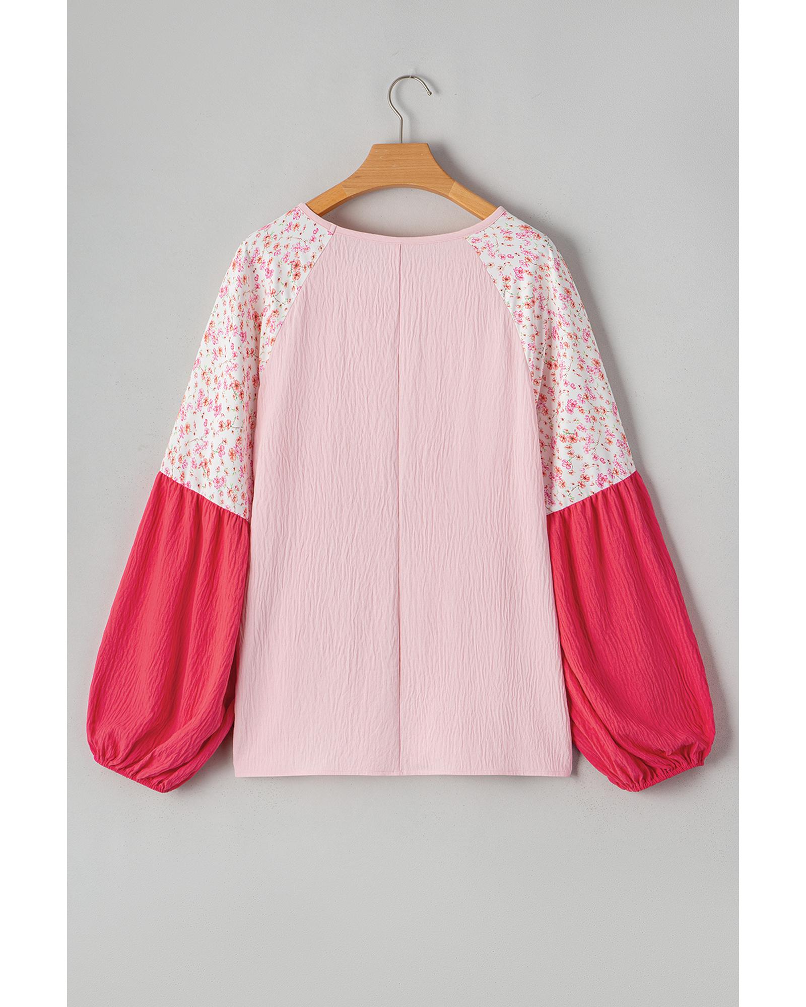 Pink Contrast Floral Patchwork Long Sleeve Plus Size Blouse – 3X