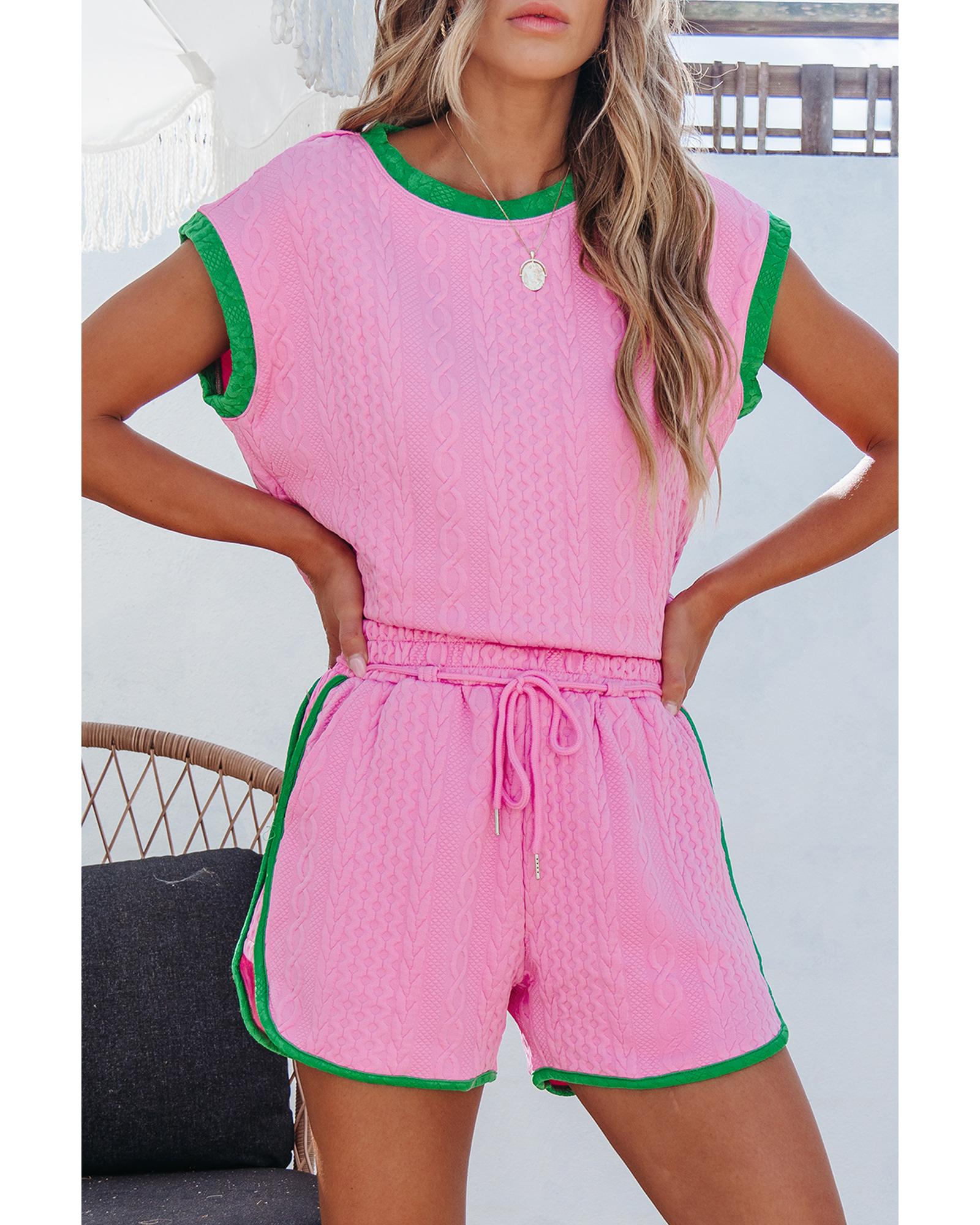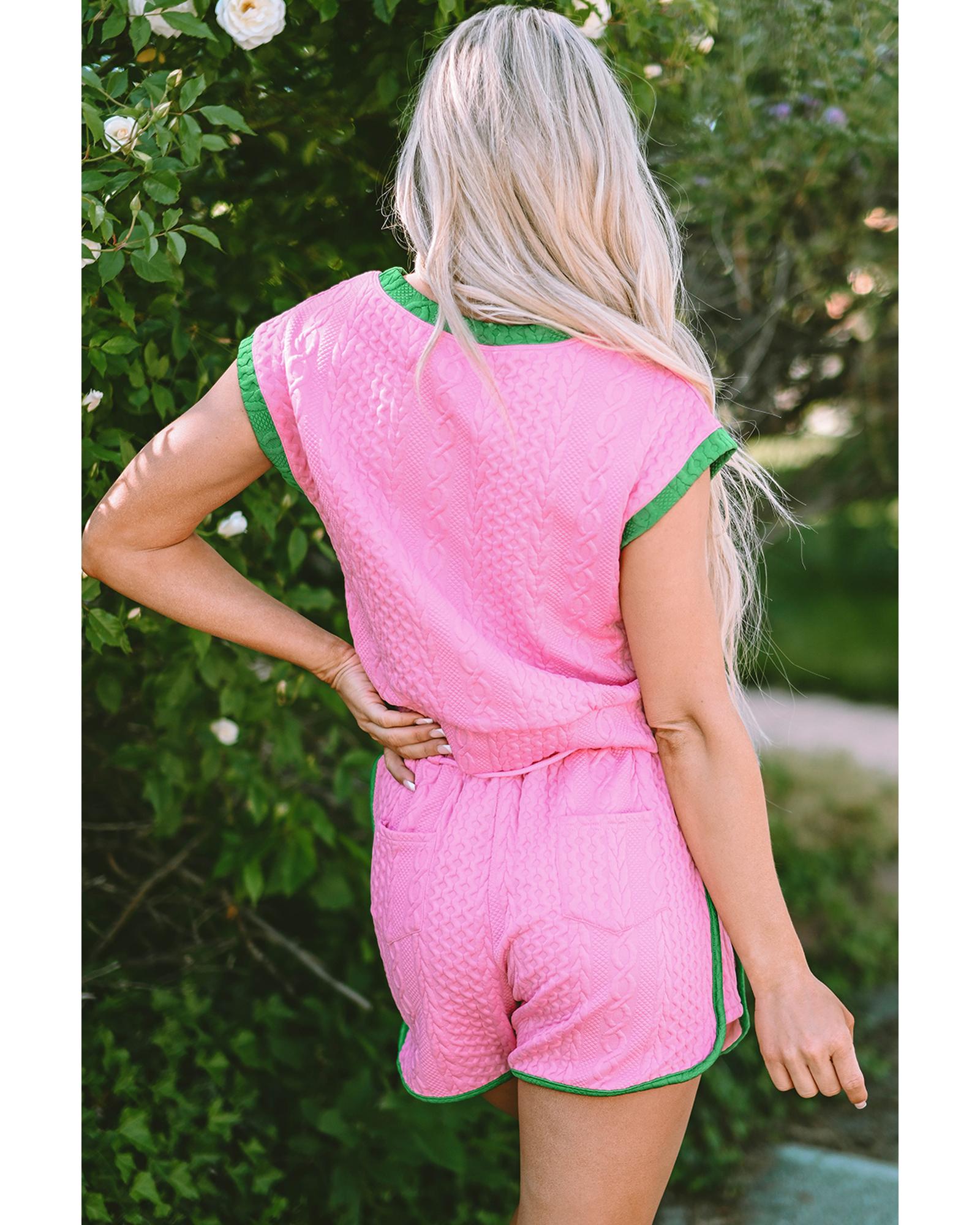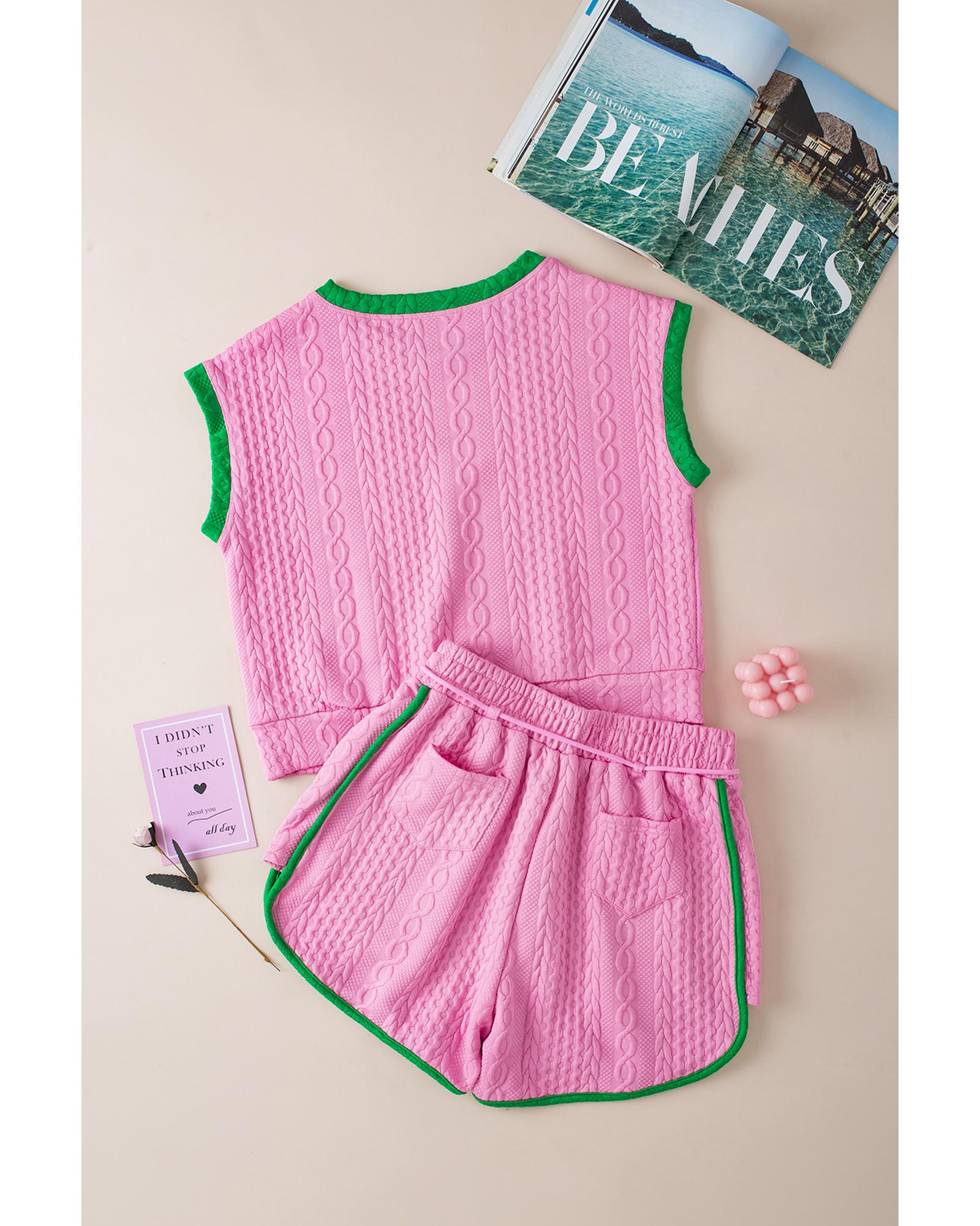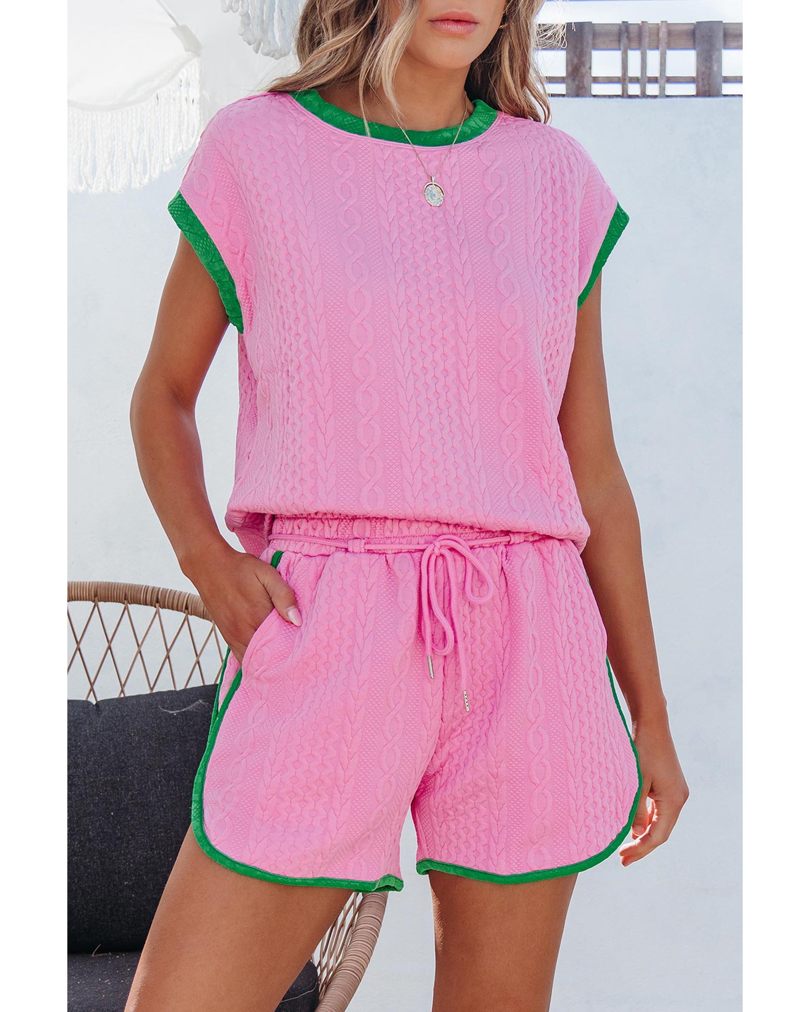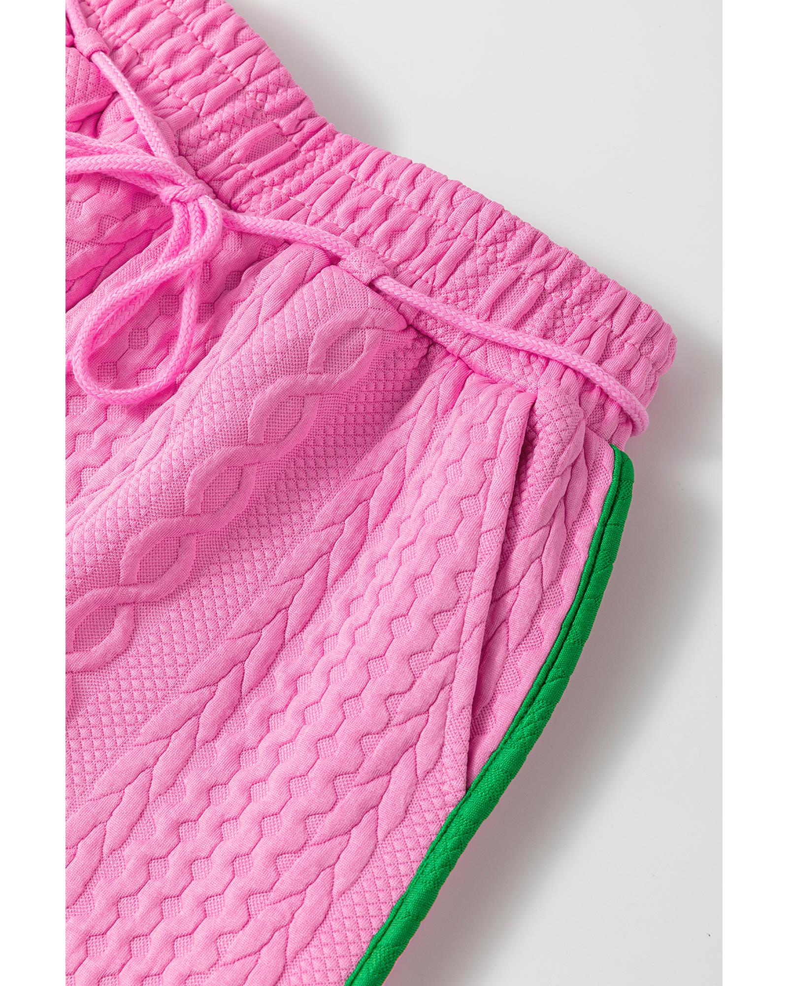 Pink Contrast Trim Cable Textured Shorts Set – L