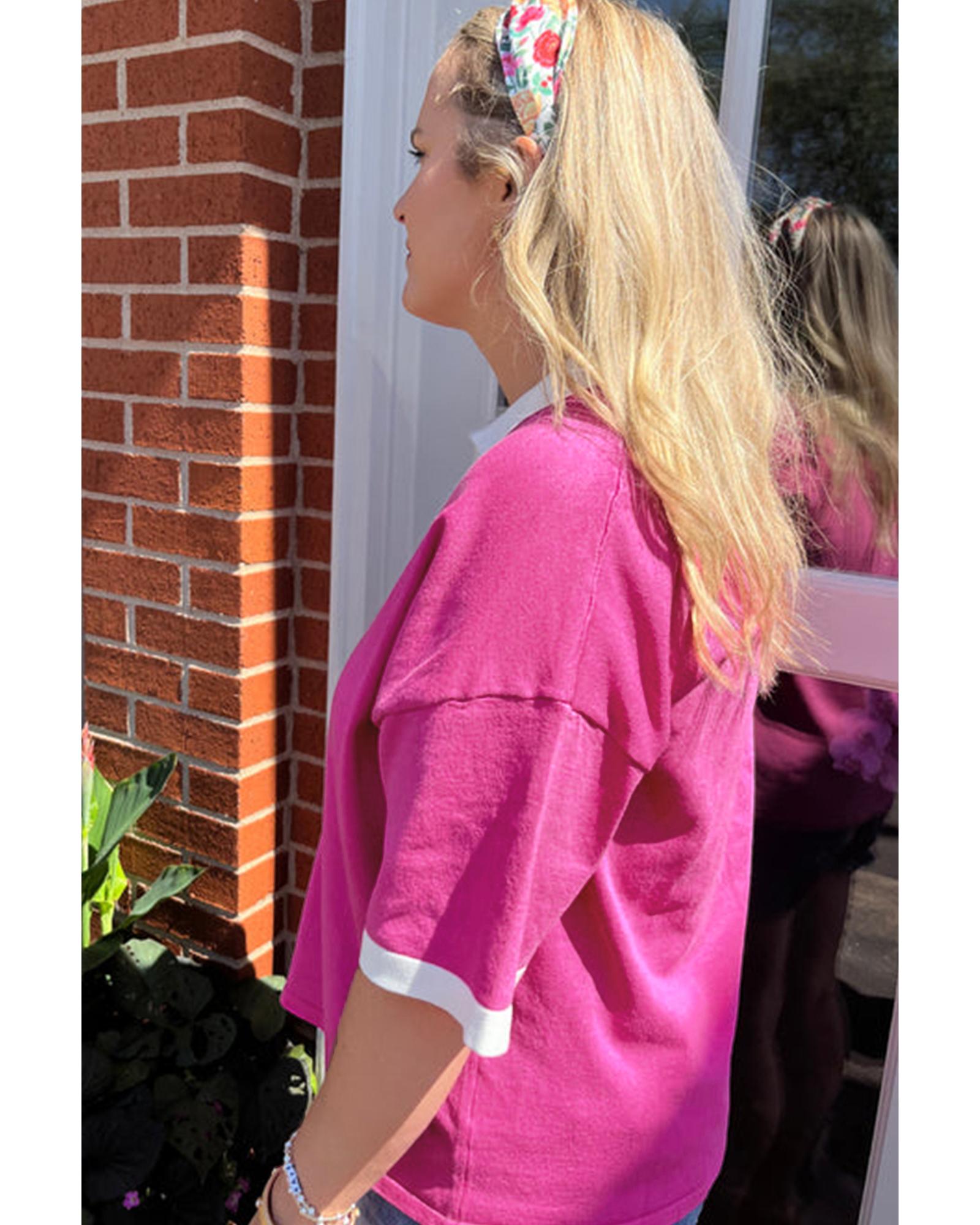 Pink Contrast Trim Collared Split Neck Short Sleeve Plus Size Top – 1X