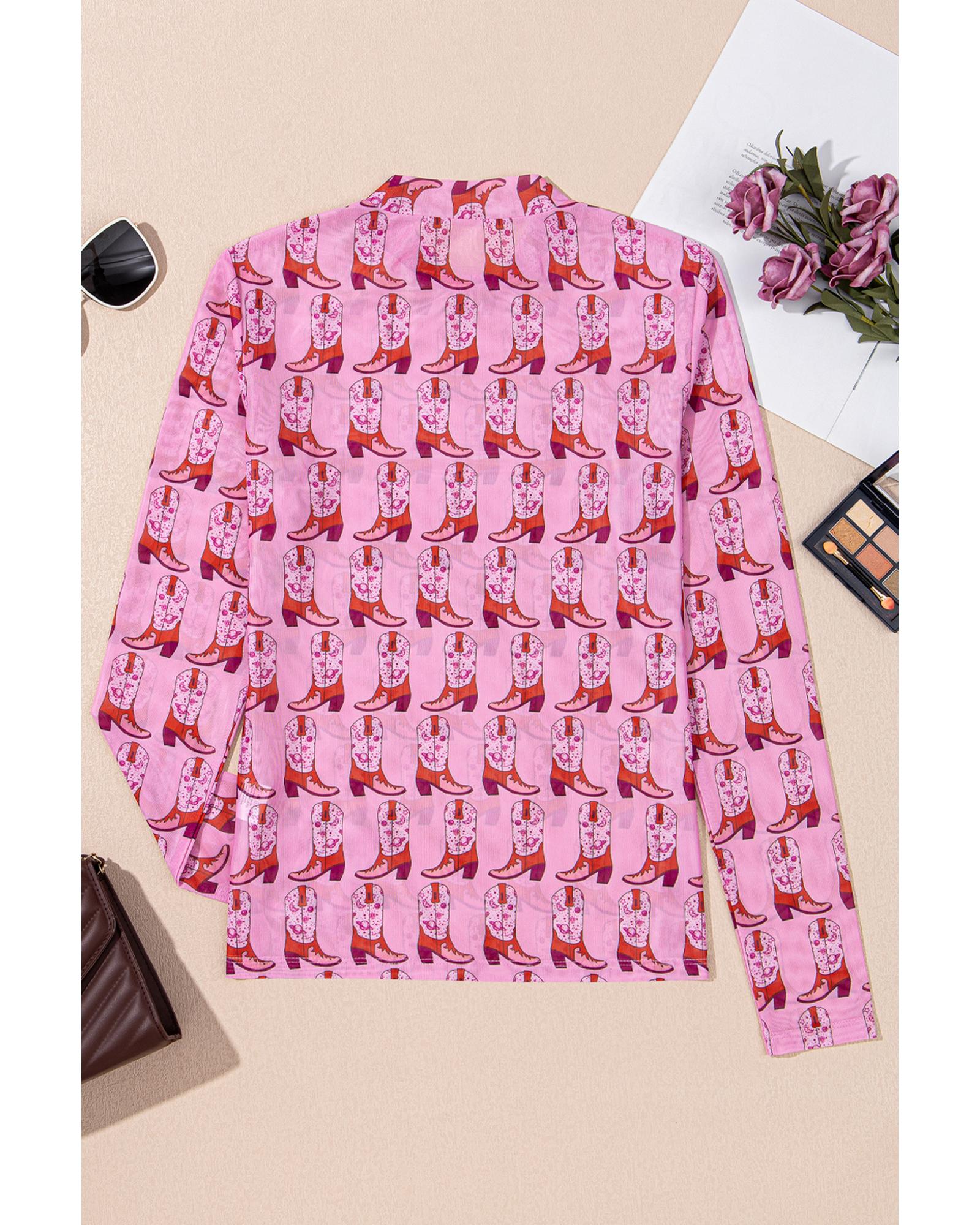 This Pink Cowgirl Boots Printed Mock Neck Long Sleeve Mesh Top combines Western-inspired design with modern fashion elements. It features a stylish cowgirl boots print, a trendy mock neck, and long sleeves, making it suitable for various styling options. The slim fit design enhances the silhouette, and the soft, stretchy mesh material ensures comfort throughout the day.