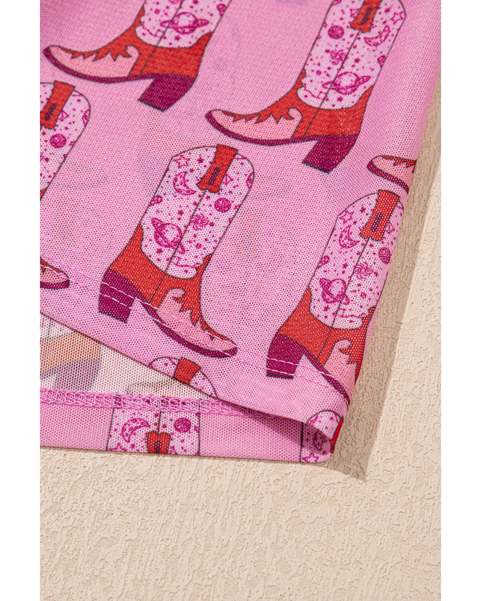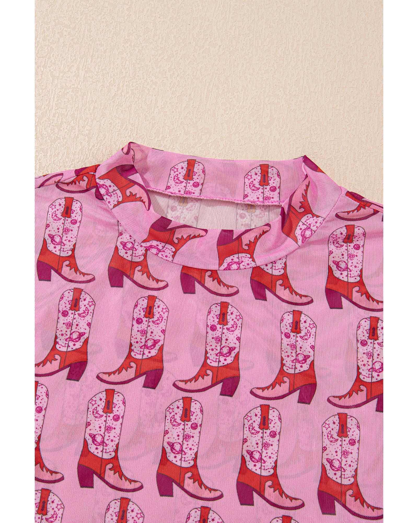 Pink Cowgirl Boots Printed Mock Neck Long Sleeve Mesh Top – S
