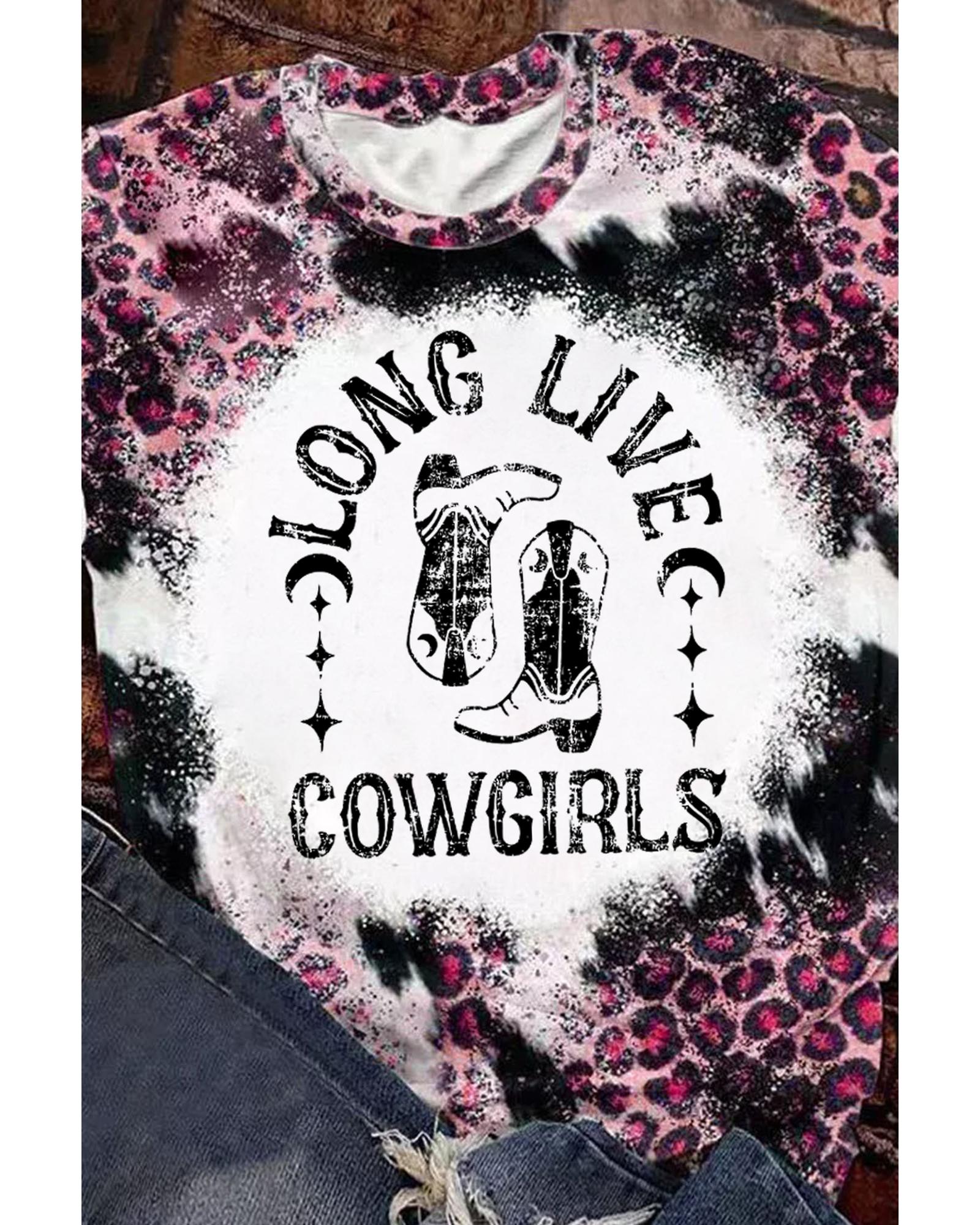 Pink Cowgirls Boots Leopard Bleached Crew Neck T Shirt – L
