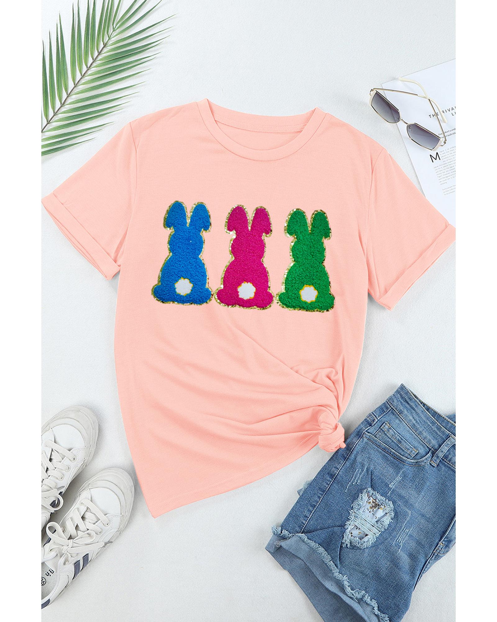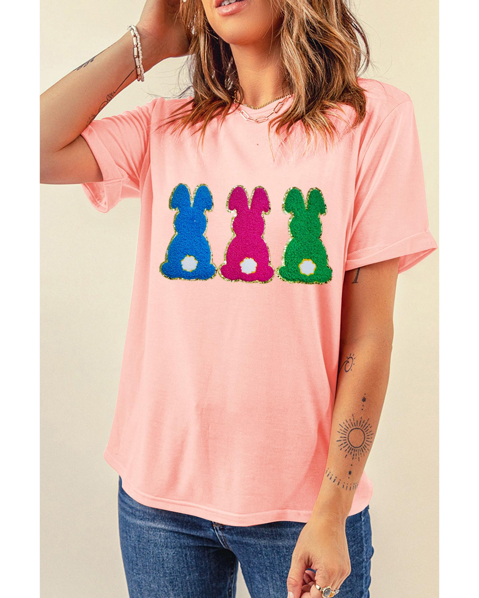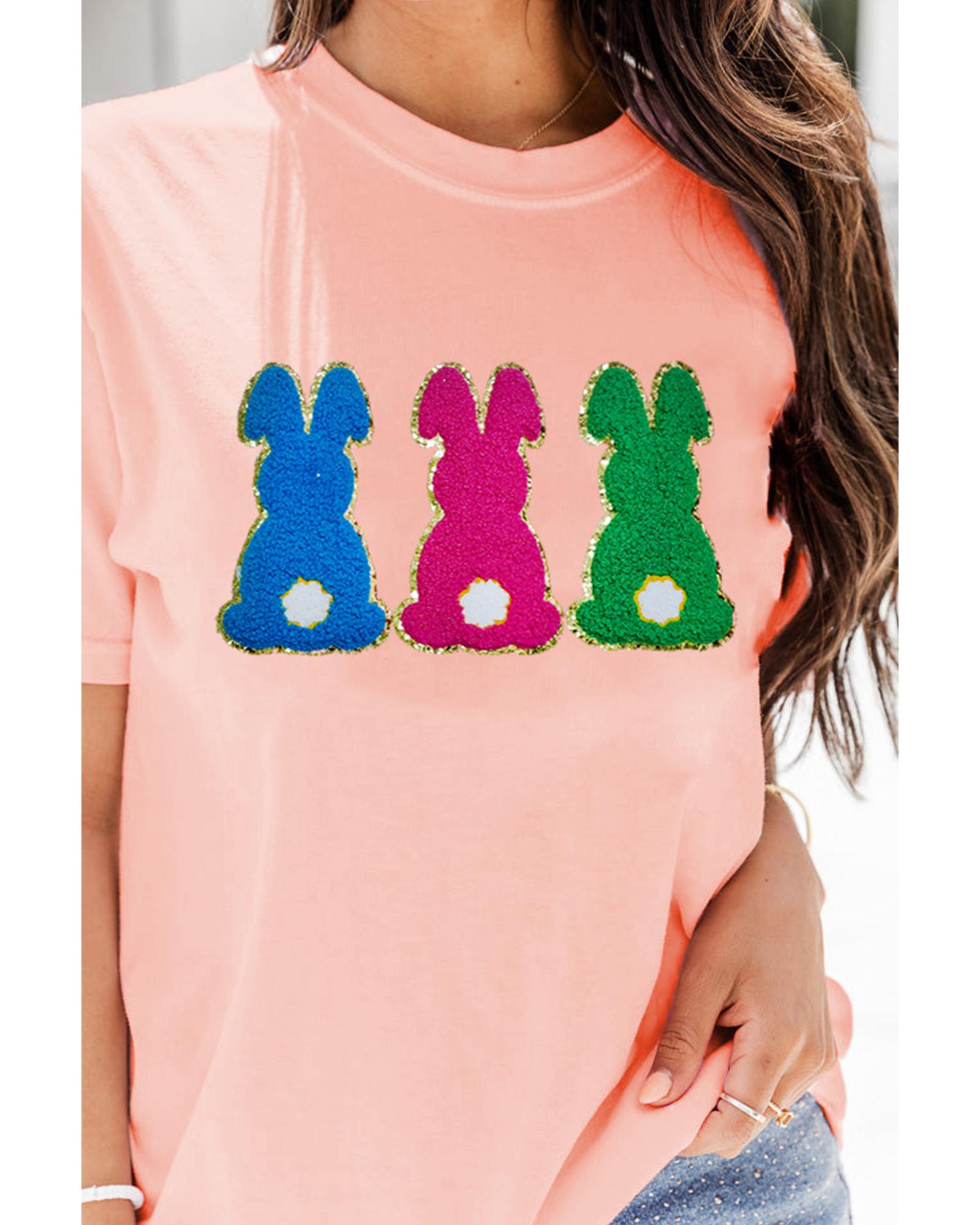 Package Content: One pink Easter Bunny chenille patched graphic tee in selected size.