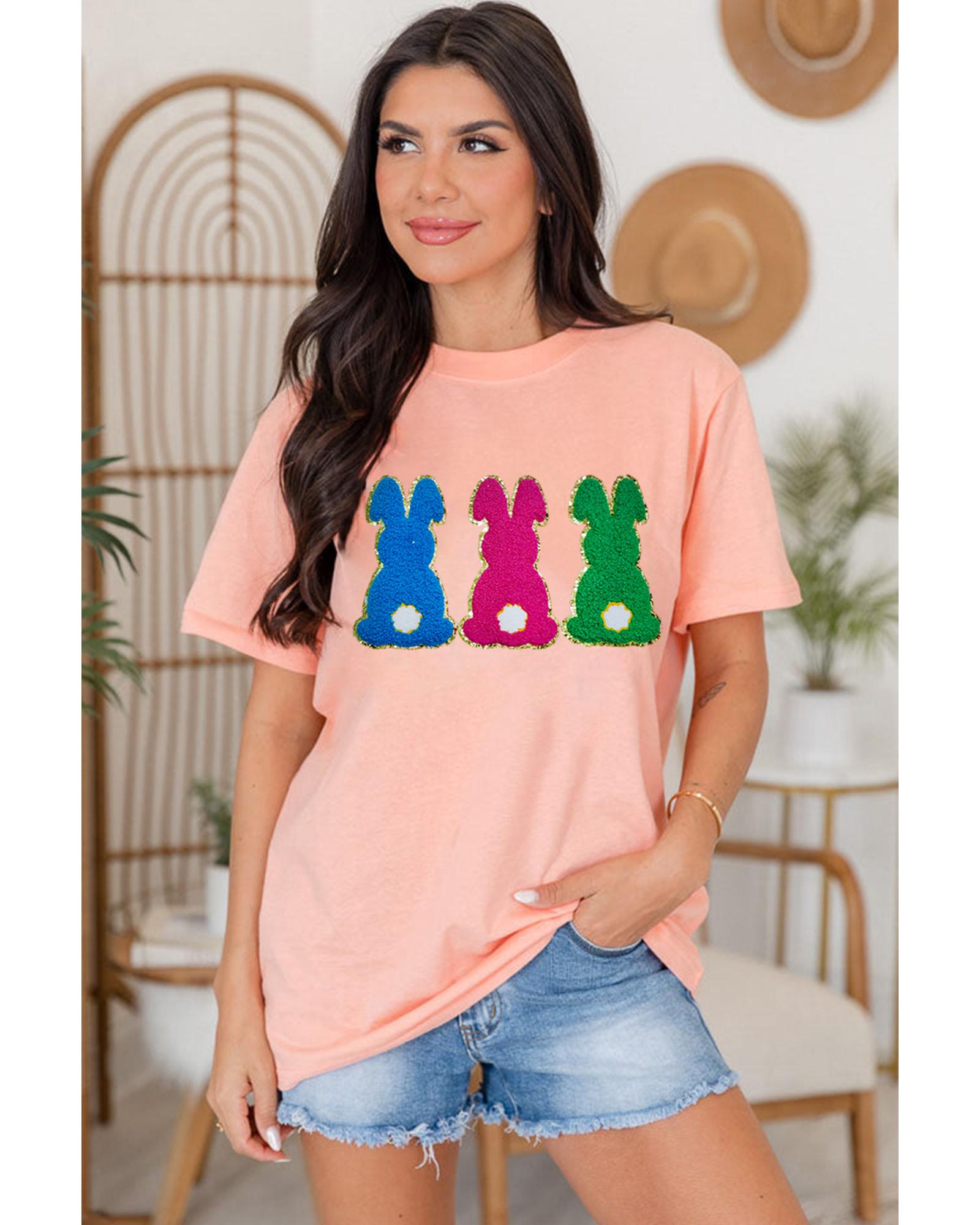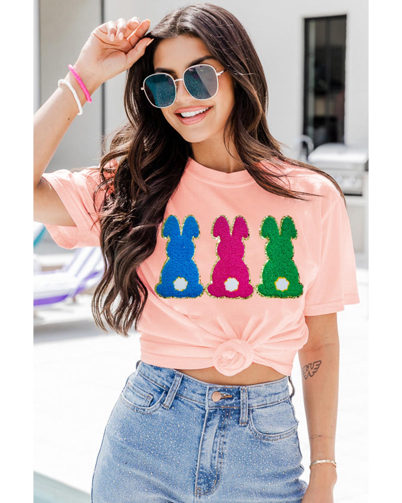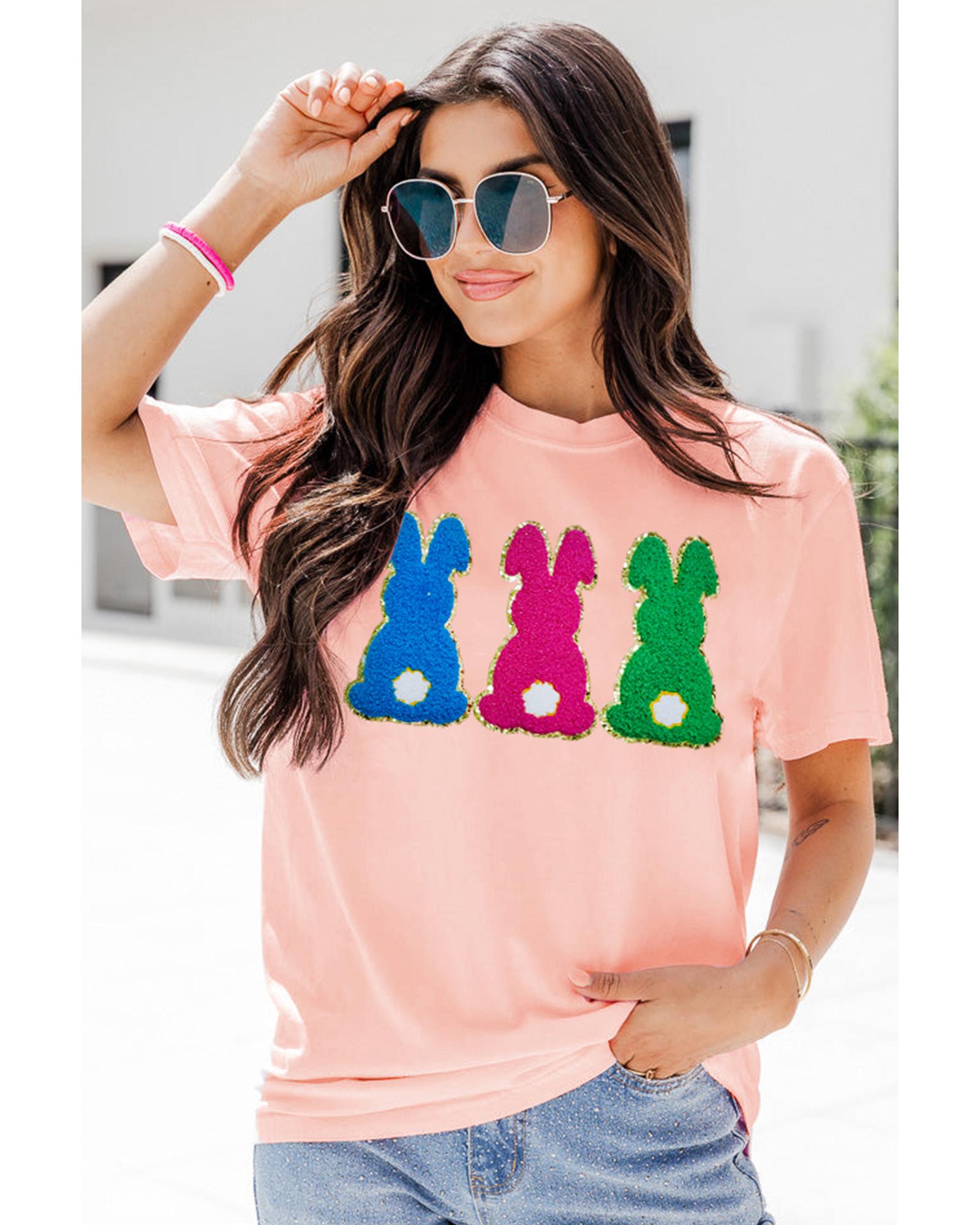 Package Content: One pink Easter Bunny chenille patched graphic tee in selected size.