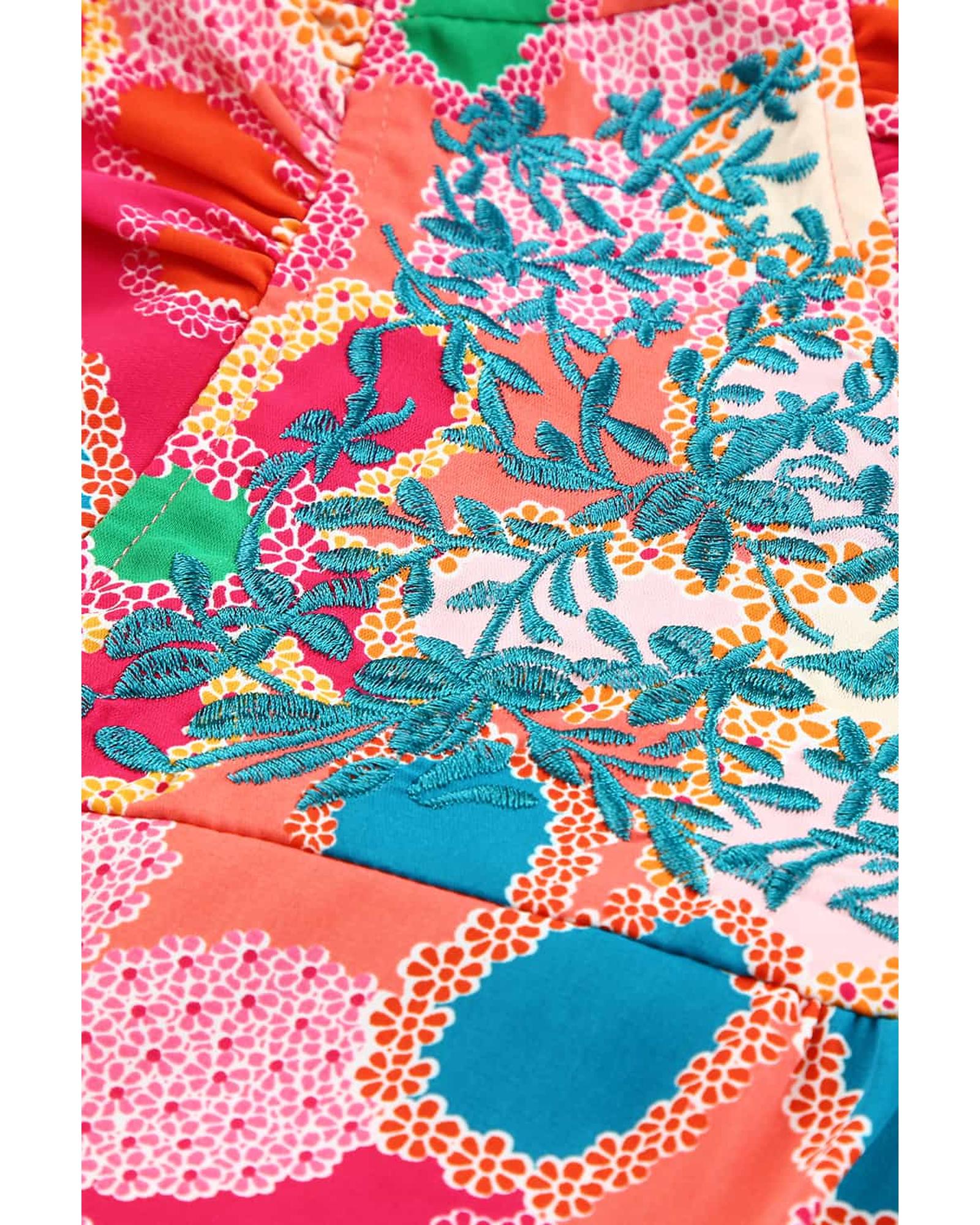 This tank top features a delicate floral print with embroidered details and ruffle trim, offering a stylish and feminine look. It is designed with a fitted silhouette to enhance your shape and provide a trendy appearance. Made from soft, lightweight material, it ensures comfort for everyday wear.
