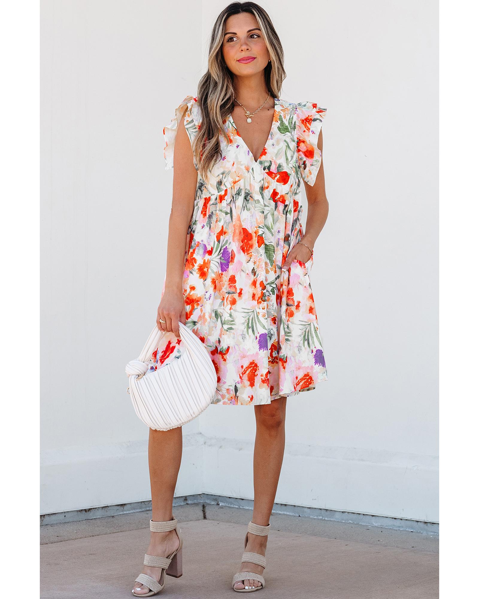 This pink floral mini dress features a stylish V neckline and a high waist design, creating a flattering silhouette. The double ruffle sleeves add a touch of elegance, making it an ideal choice for spring and summer occasions. The empire waist enhances a slimming effect, offering both comfort and style.